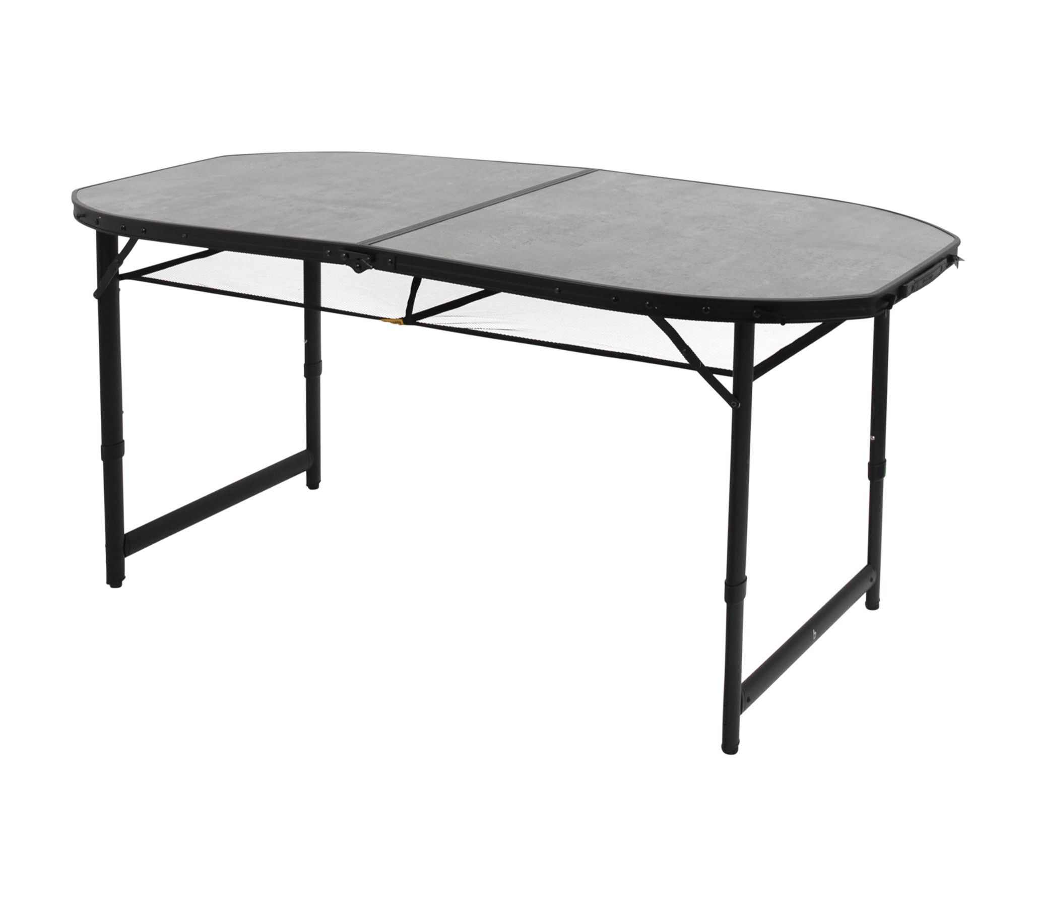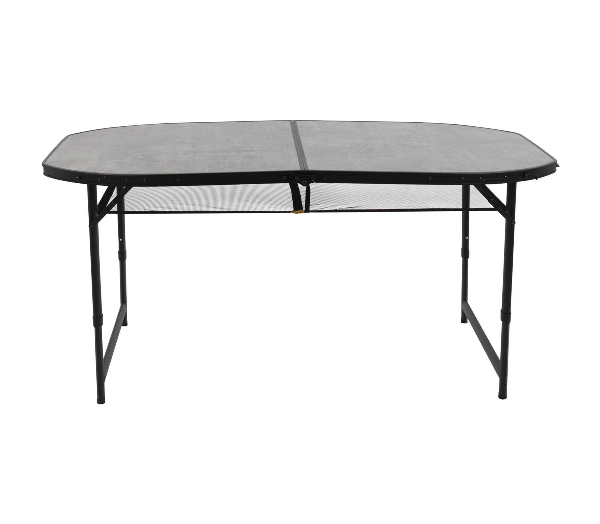 Большой и одновременно легкий стол Bo-Camp Northgate Oval 150x80 cm Black/Grey из коллекции Industrial станет незаменимым спутником вашего отдыха в саду, на даче или на природе. Размер и форма столешницы позволяет разместить за ним до 8-10 человек, а сетка под столешницей поможет не загружать поверхность вещами. Корпус стола, выполнен из алюминия и легко складывается, а телескопические ножки стола регулируются по трем высотам (55/65/70 см). Ножки также можно отрегулировать на неровной поверхности с помощью винтов. Bo-Camp Northgate Oval можно компактно хранить и переносить в виде кейса, благодаря складной столешнице и ручке. В транспортном положении стол зафиксирован четырьмя замками, предотвращающими самопроизвольное раскрытие.