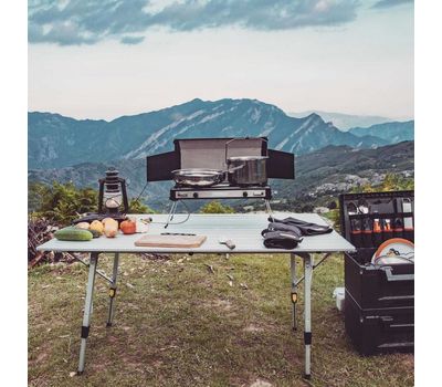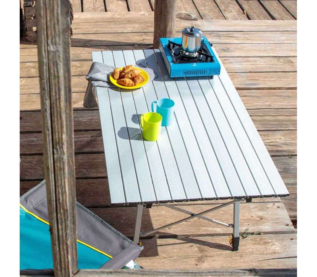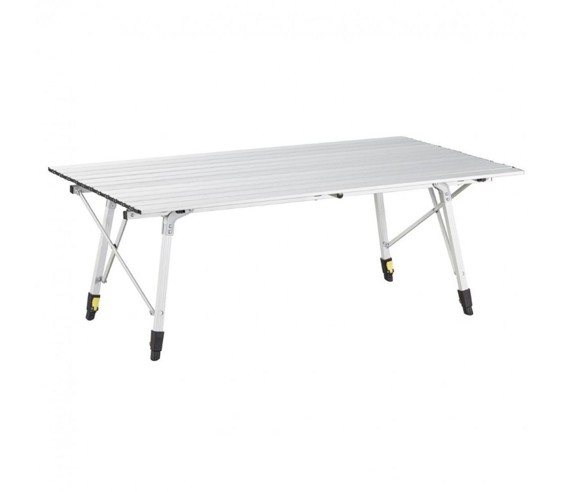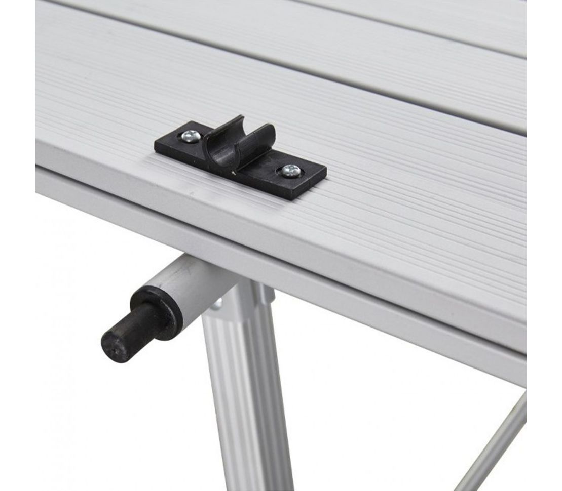 Столешница имеет достаточные размеры, чтоб за столом комфортно разместились 4 человека. В сложенном виде стол компактно размещается в чехле. Алюминиевая поверхность столешницы легко чистится, и является максимально гигиеничной, поскольку алюминий не формирует среду для размножения микробов.