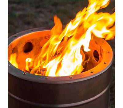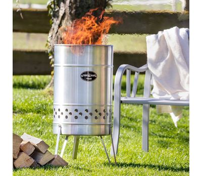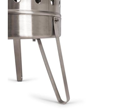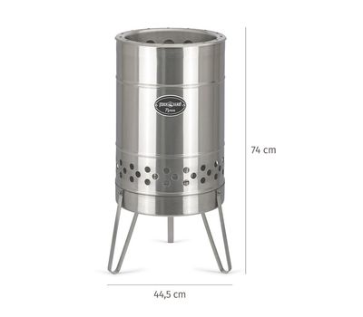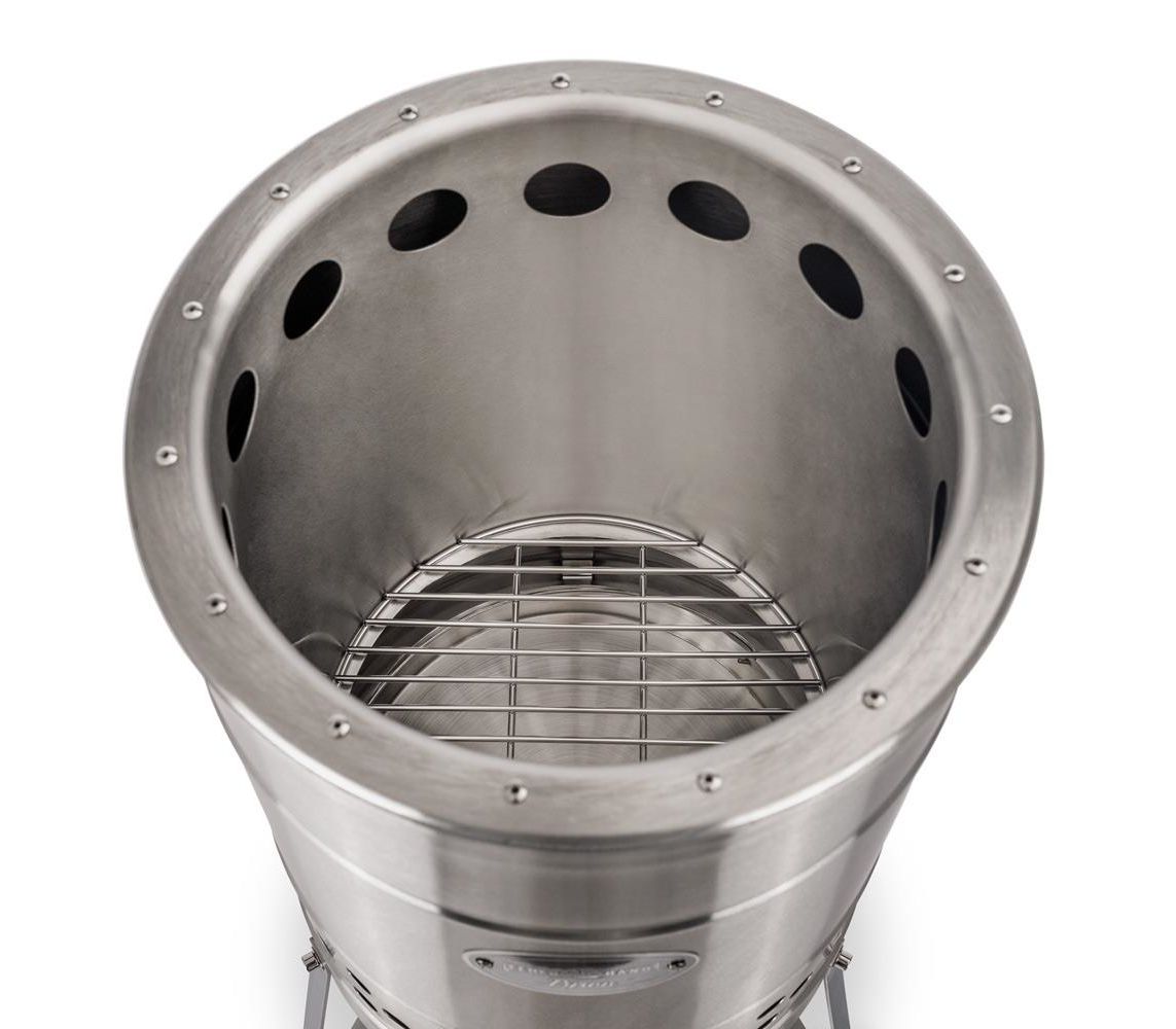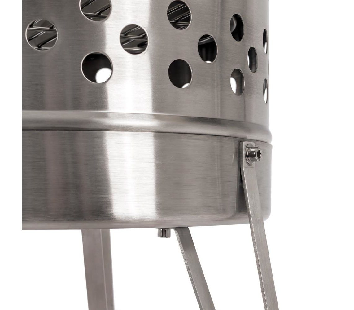 - Циліндричний корпус із нержавіючої сталі вміщує великий обʼєм дров. Високі стінки захищають полум'я від вітру й перешкоджають розвіюванню попелу.