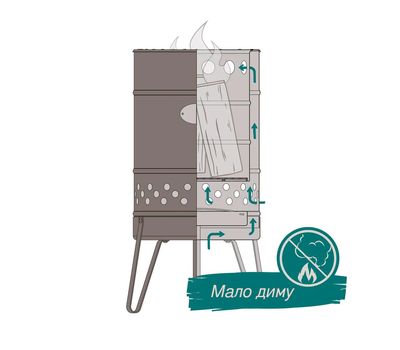 Проста конструкція має низку інженерних рішень. Подвійні стінки тримають високу температуру в топці, натомість зовні діжка майже не нагрівається. Просунута система вентилювання забезпечує ефективне горіння практично без диму.