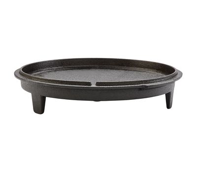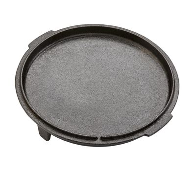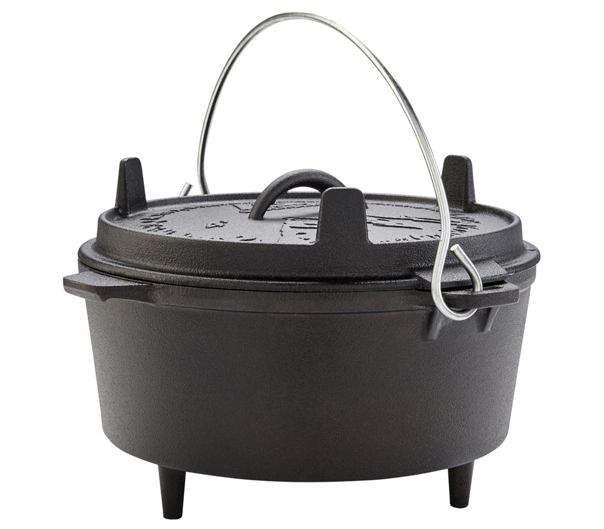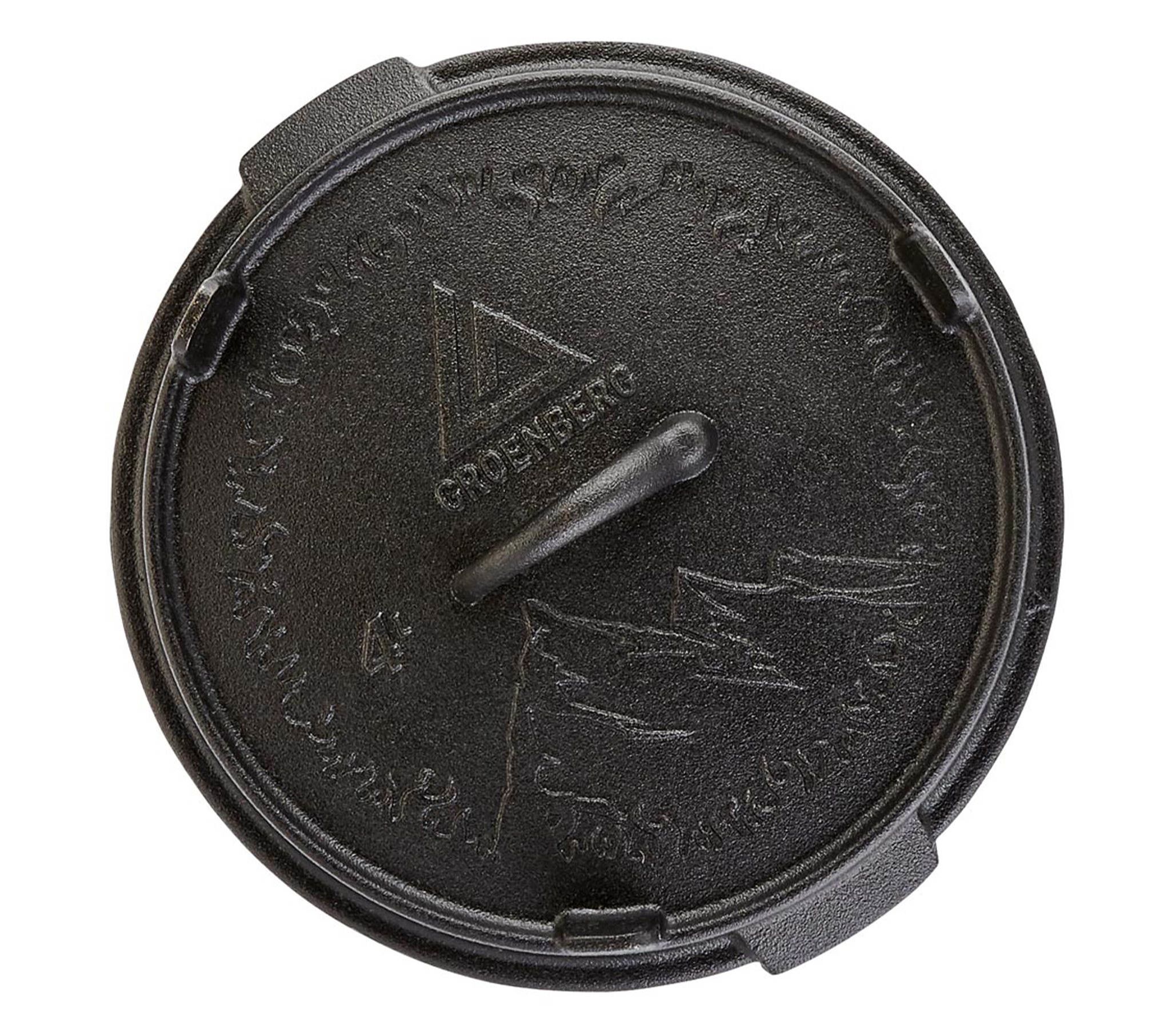 Массивная крышка с тремя ножками выполняет функцию сковородки или сервировочной тарелки - ее удобно ставить на угли или стол. Легкая вогнутость крышки позволяет конденсату равномерно стекать к краям, не капая в блюдо при открытии. Отверстие для выпуска пара предотвращает перекипание или дребезжание крышки во время приготовления. В него также можно вставить термометр с выносным щупом и контролировать температуру блюда.
