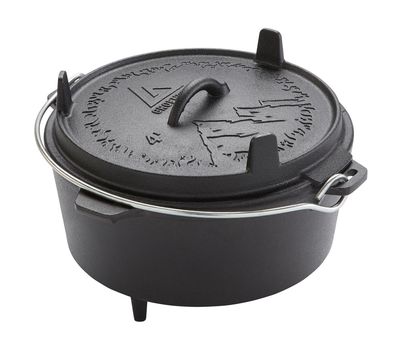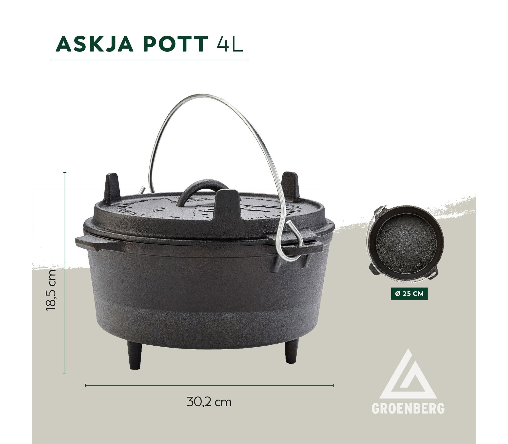 Groenberg Askja совместим со всеми источниками тепла: открытый огонь, гриль, газовая или электрическая плита, духовка. Ножки на дне обеспечивают стабильное расположение на углях, а крышка позволяет накладывать жар сверху для создания эффекта духовки.