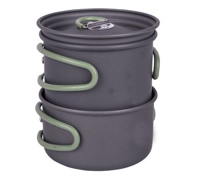 Этот набор состоит из 2 кастрюль и 1 крышки. Он изготовлен из легкого анодированного алюминия, который, благодаря высокой теплопроводимости, значительно ускоряет приготовление пищи и экономит топливо. А складная ручка из термостойкого силикона не нагревается и ее можно легко обернуть вокруг кастрюли после использования, чтоб кастрюли можно было компактно хранить и транспортировать. Также в этом наборе посуды достаточно места для хранения газового картриджа Campingaz C-206 (190 грамм).