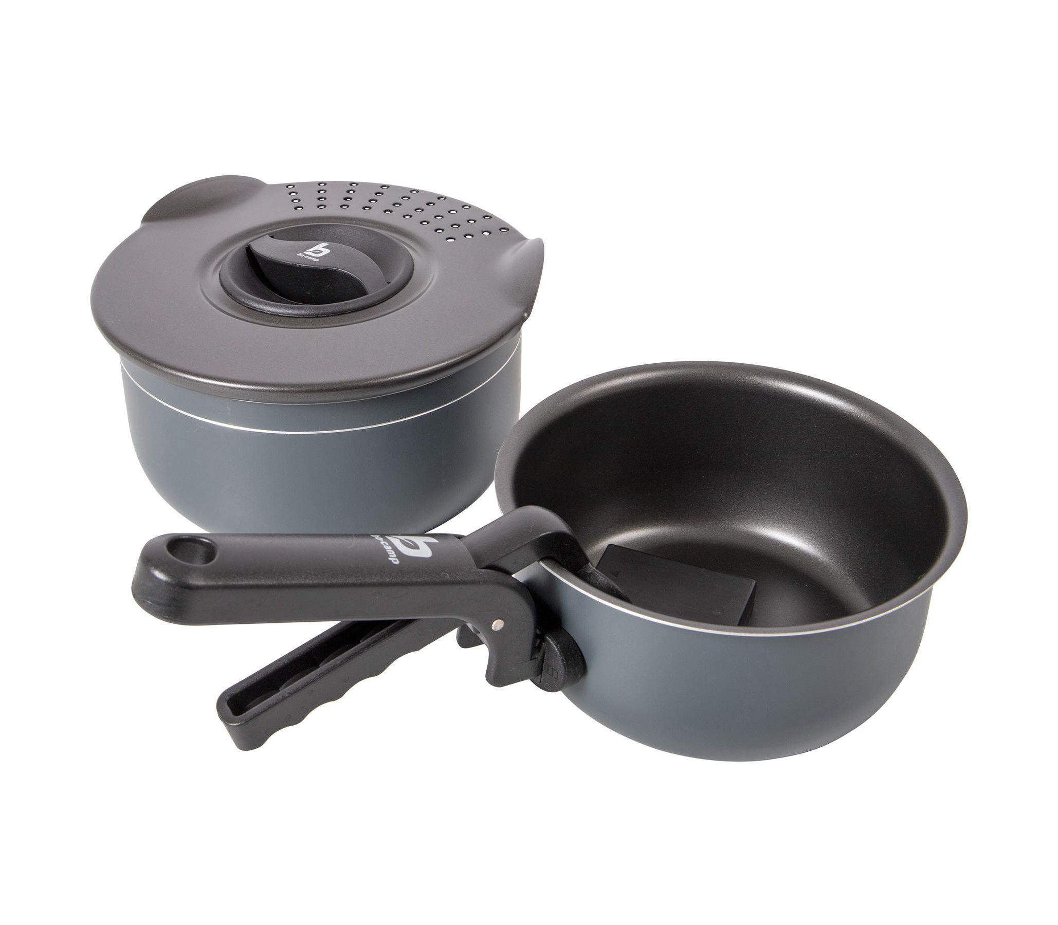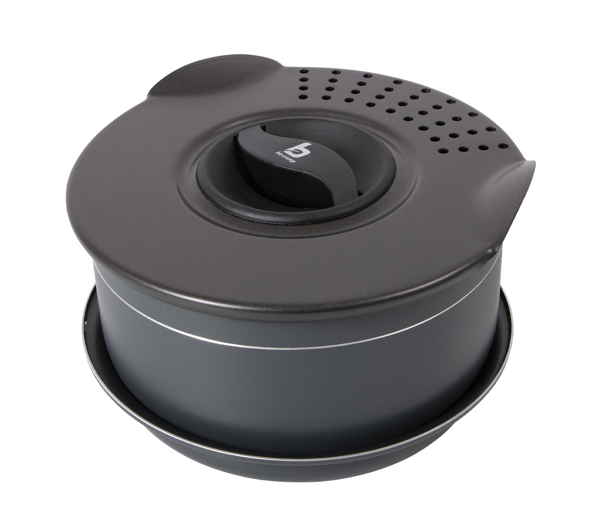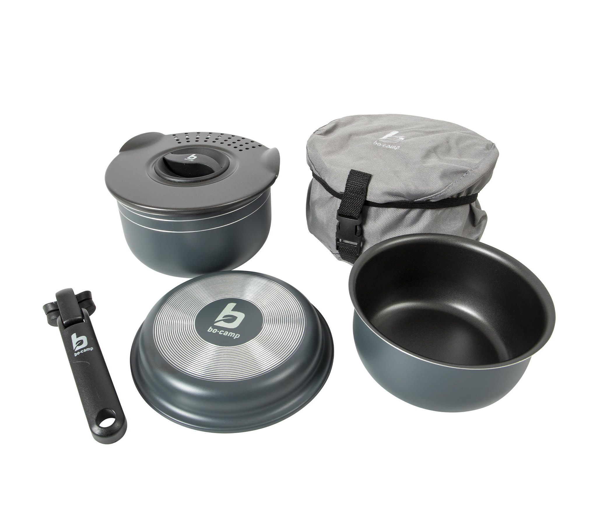 Bo-Camp Trekking 5 Pieces Anthracite – это компактный и практичный набор посуды с антипригарным покрытием для кемпинга и экспедиций, рассчитанный на группы до 3-4 человек.