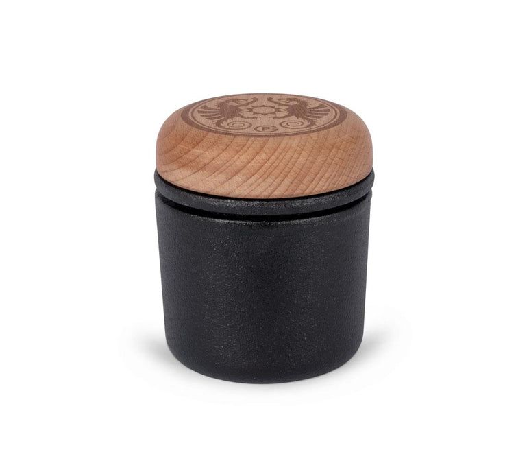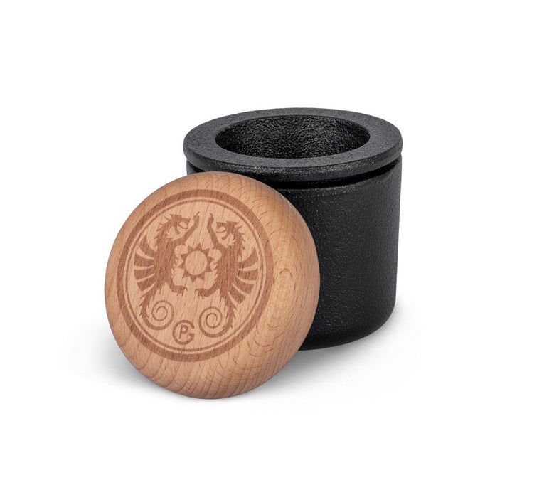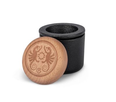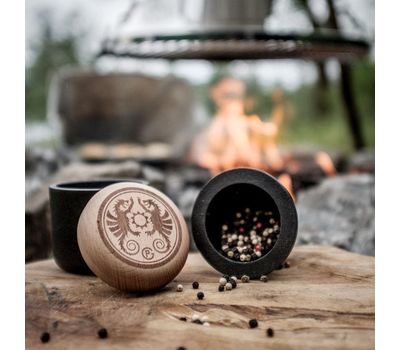 Чавунна ступка для прянощів від німецького бренду Petromax. Дозволяє подрібнювати прянощі, насіння й горіхи безпосередньо перед барбекю, отримуючи максимум аромату. А також зберігати їх у вбудованому герметичному контейнері з деревʼяною кришкою.