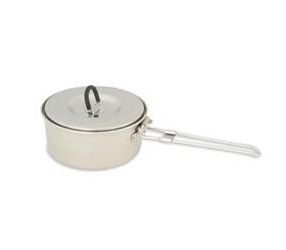 Кастрюля объемом 0.6 литр. Складная ручка может использоваться еще и как затвор с хомутиком для закрепления крышки.
