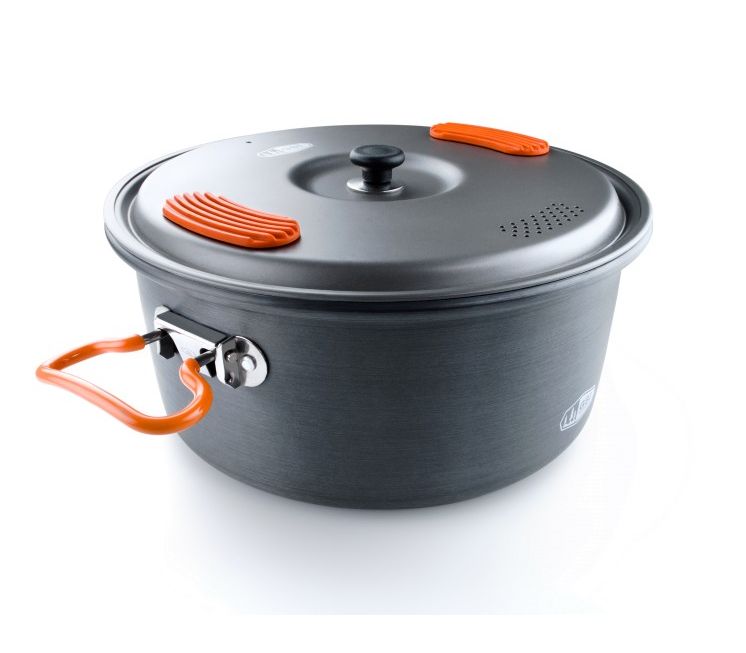 Легкая удобная кастрюля из анодированного алюминия, еще и более эффективная, что позволяет брать с собой намного меньше газа.