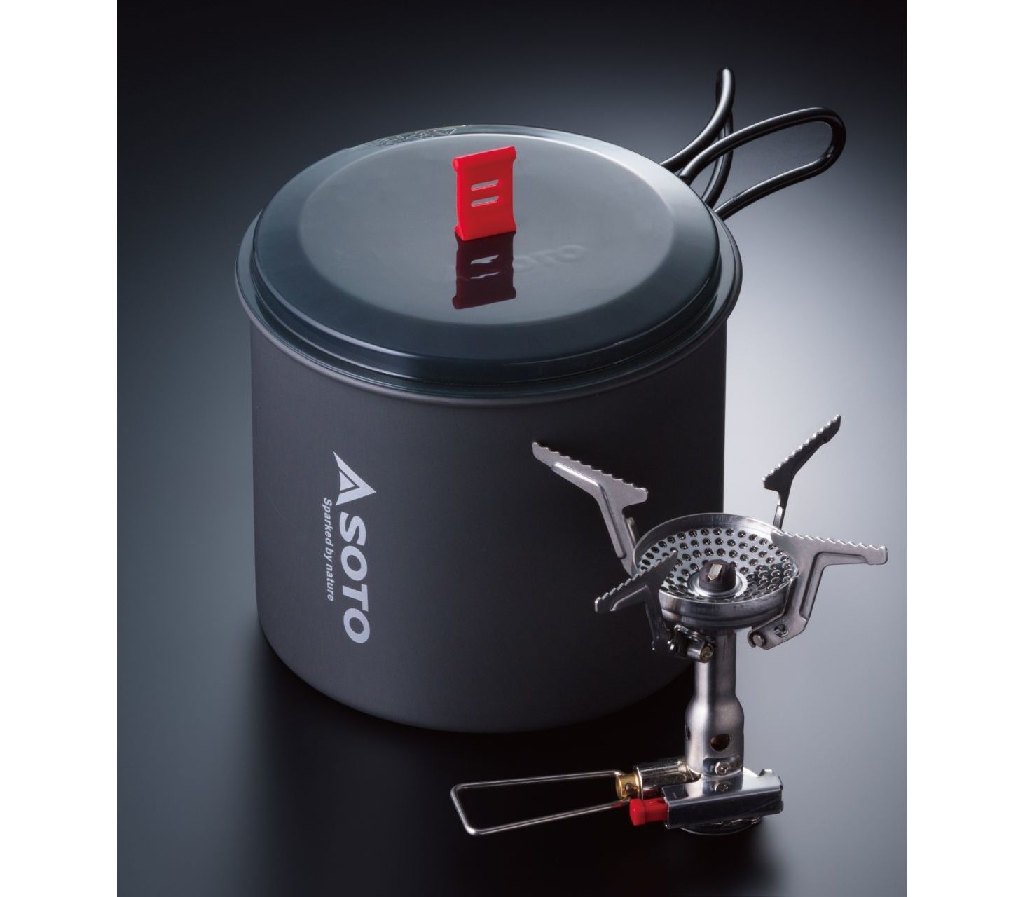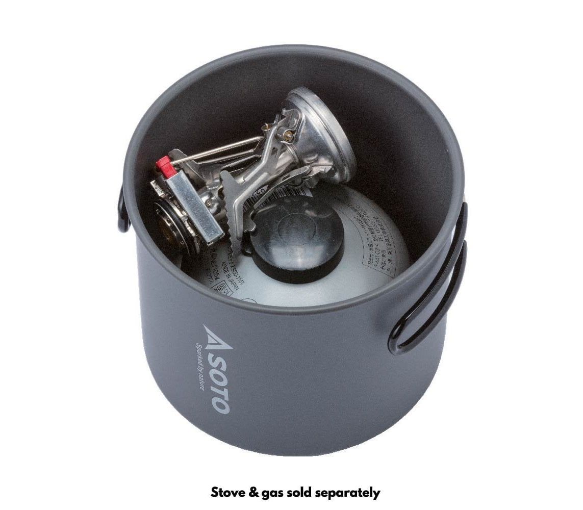 В котелок помещается газовый баллон на 110гр + газовая горелка Soto Amicus или Soto Windmaster в сложеном состоянии.