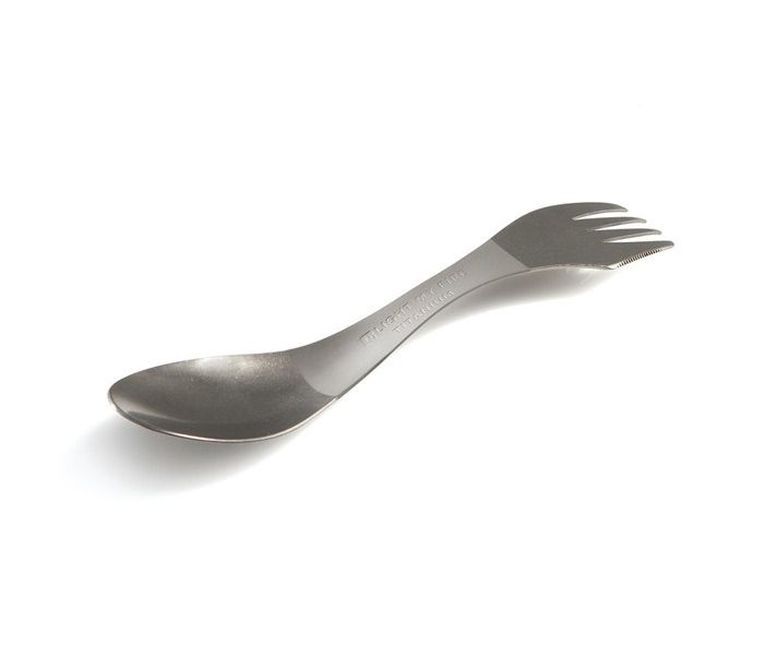 Универсальный столовый прибор "ложка-вилка-нож" из титана, прочного и легкого материала.
