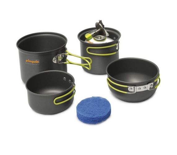 В комплект входят две кастрюли, две крышки и одна губка для мытья.Поверхностный слой анодирован, что придает изделиям огнестойкость, износостойкость. Меньшая кастрюля помещается в большую. Комплект обеспечивает безопасную транспортировку газовых баллонов и маленькой горелки. Горелка и картридж не включены в комплект.
