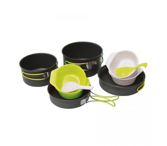 В комплект входят две кастрюли, две сковороды (крышки), две ложки и четыре тарелки.Набор предназначен для 3-5 человек. Поверхностный слой анодирован, что придает изделиям огнестойкость, износостойкость. Сковородки могут быть использованы как крышки для кастрюль.