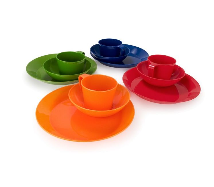Удобный компактный набор посуды из переработанного пластика для четырех человек.