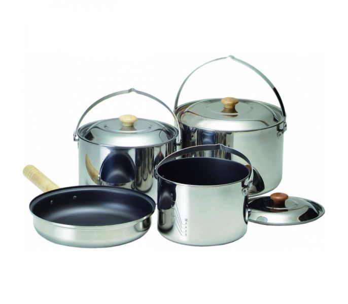 Набор посуды Kovea Family STS Cookset из высококачественной нержавеющей стали в удобном нейлоновом чехле с ручками. Это удачный выбор для тех, кто даже на природе не может отказать себе готовить в высококачественной посуде. В наборе нет ничего лишнего. Только три кастрюли и сковорода. Он не будет надоедать вам выкладыванием и упаковыванием обратно для транспортировки, мелких столовых предметов. Кастрюли из толстой нержавейки не имеют пластмассовых частей, не деформируются от температуры, легко моются и пища в них меньше пригорает. Благодаря этому их можно ставить на угли и даже вешать на костер. Сковороду со съемной ручкой можно ставить как на угли, так и в духовку. Этот набор сделает готовку приятнее и в кемпинге и на рыбалке. А большая кастрюля дымящейся ухи с дымком, приготовленная на костре; сделает более яркими впечатления от поездки на природу.