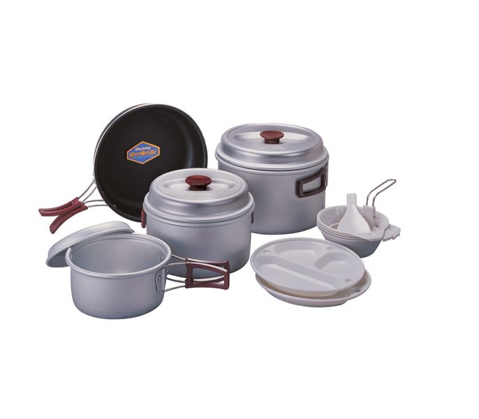 Перечень приборов:3 кастрюли на 2,91,81.0 литра, тефлоновая сковорода, пластиковые чашки, тарелки, половник, лопатка