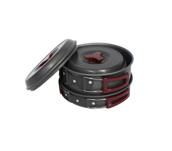 Набор посуды из анодированого алюминия с антипригарным покрытием, который состоит из трех компонентов: котелок 1,5 л, котелок 1,0 л, крышка. Верхний слой стойкий к истиранию и на нем не подгорает пища. Ручки кастрюль защищены от горения пластика. Крышка имеет небольшое отверстие для выхода пара.