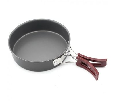 Широкая сковорода из анодированного алюминия. Оснащена складными ручками. Износостойкое внешнее покрытие легко моется и не боится открытого огня. Не окисляется даже при длительной эксплуатации. Упакована в сетчатый мешочек.
