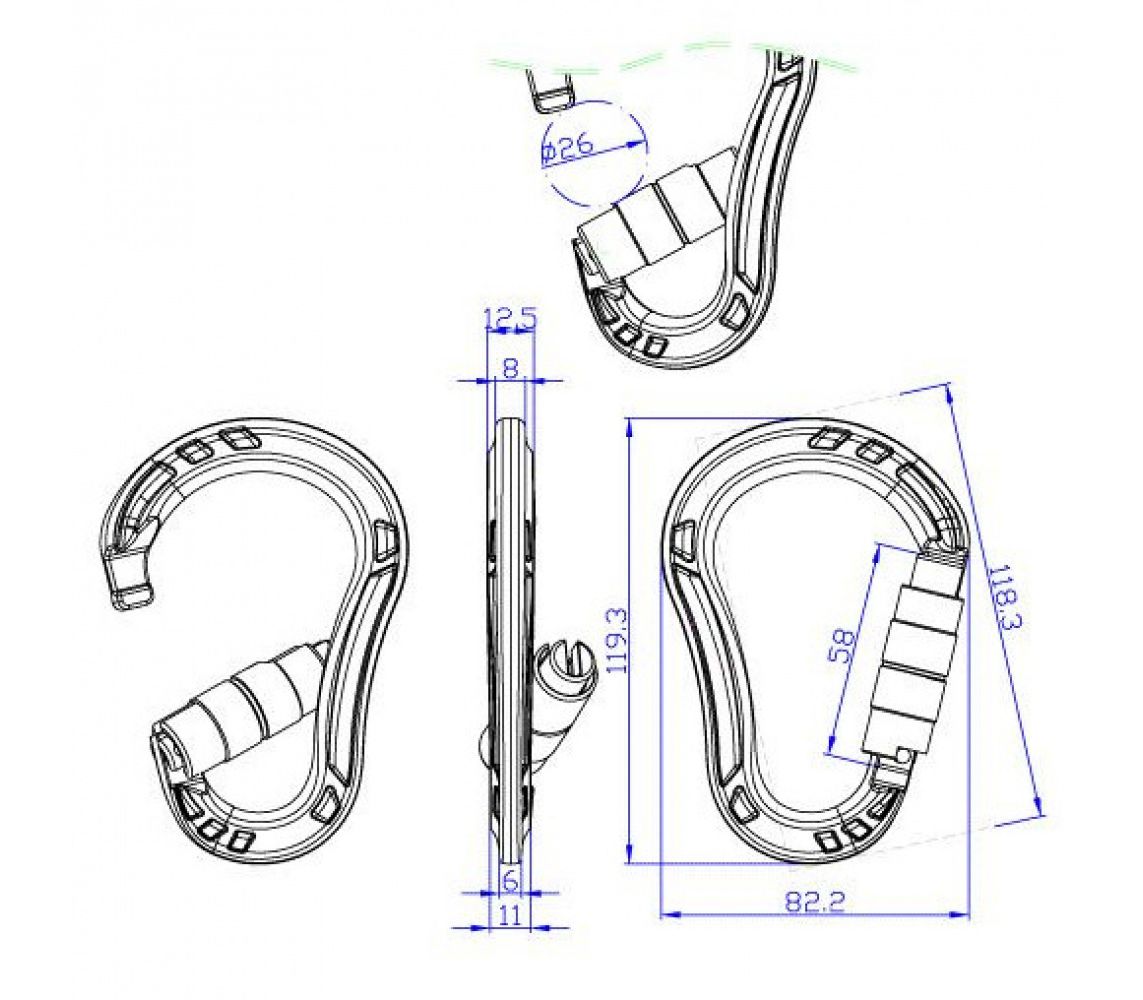 - карабін має скошене відкриття і найбільше серед карабінів свого класу розкриття засувки-26 мм, що зручно при роботі з великою кількістю спорядження