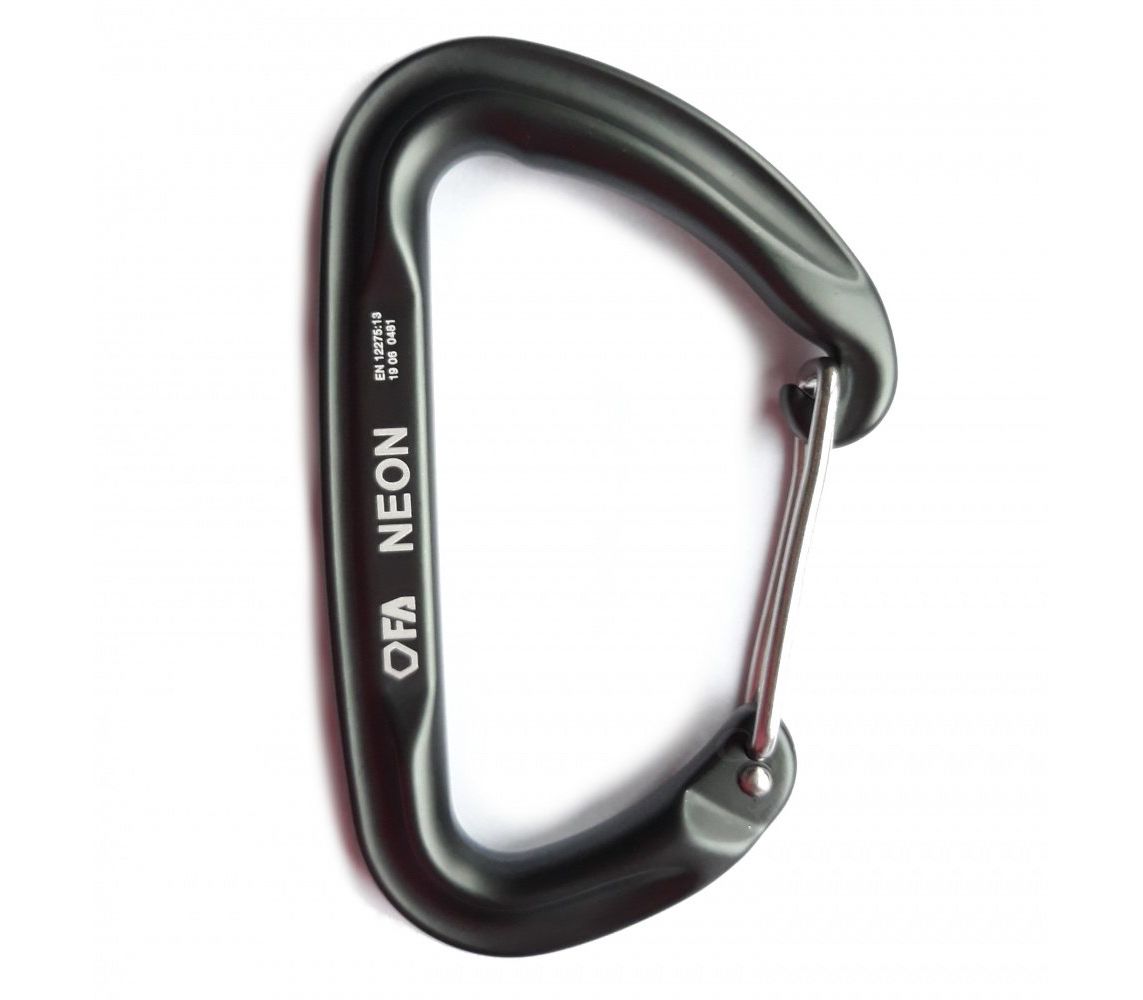NEON grey-анодований карабін з прямою дротяною засувкою. Зроблений з легкого алюмінієвого сплаву, має невелику вагу і призначений для використання з відтяжкою. Ідеально підходить для спортивного лазіння і маршрутів multi-pitch, а також у всіх ситуаціях, коли вага спорядження має велике значення.