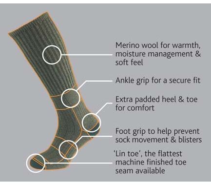 Товсті і довгі вовняні термошкарпетки для тривалих навантажень і серйозних походів. Захищають ногу від натирання і натискання завдяки спеціалізованим зонам на шкарпетці і п'яті, навколо підйому і щиколотки.
