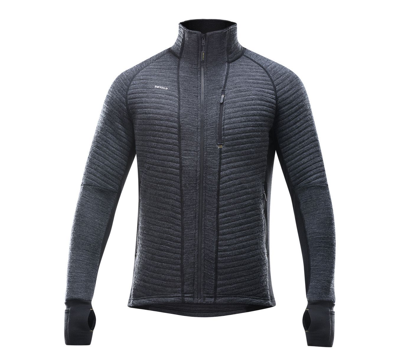 Куртка Devold Tinden Spacer має легкий і теплий середній утеплюючий шар одягу з вовни мериноса, що володіє природними терморегулюючими, дихаючими, антибактеріальними властивостями. Ідеальне співвідношення ефективного збереження тепла і мінімальної ваги. Унікальна технологія поєднання різних волокон і внутрішніх каналів, що вловлюють повітря, дозволила створити легкий і теплий середній шар. Шерсть Мериноса акумулює тепло, може вбирати, транспортувати і відводити потовиділення, зберігаючи вас в сухості, що знижує тепловтрати, забезпечує терморегуляцію, гріє у вологому стані, захищає від ультрафіолетового випромінювання і має антибактеріальні властивості. Таку куртку можна носити, не знімаючи, кілька днів поспіль. Дві кишені для рук на блискавці, одна нагрудна кишеня на блискавці. Манжети рукавів з отвором для великого пальця.