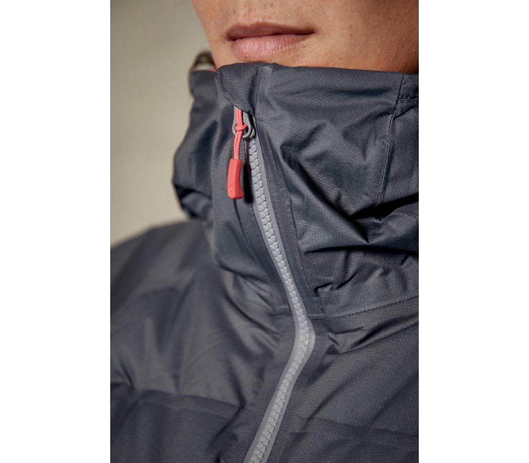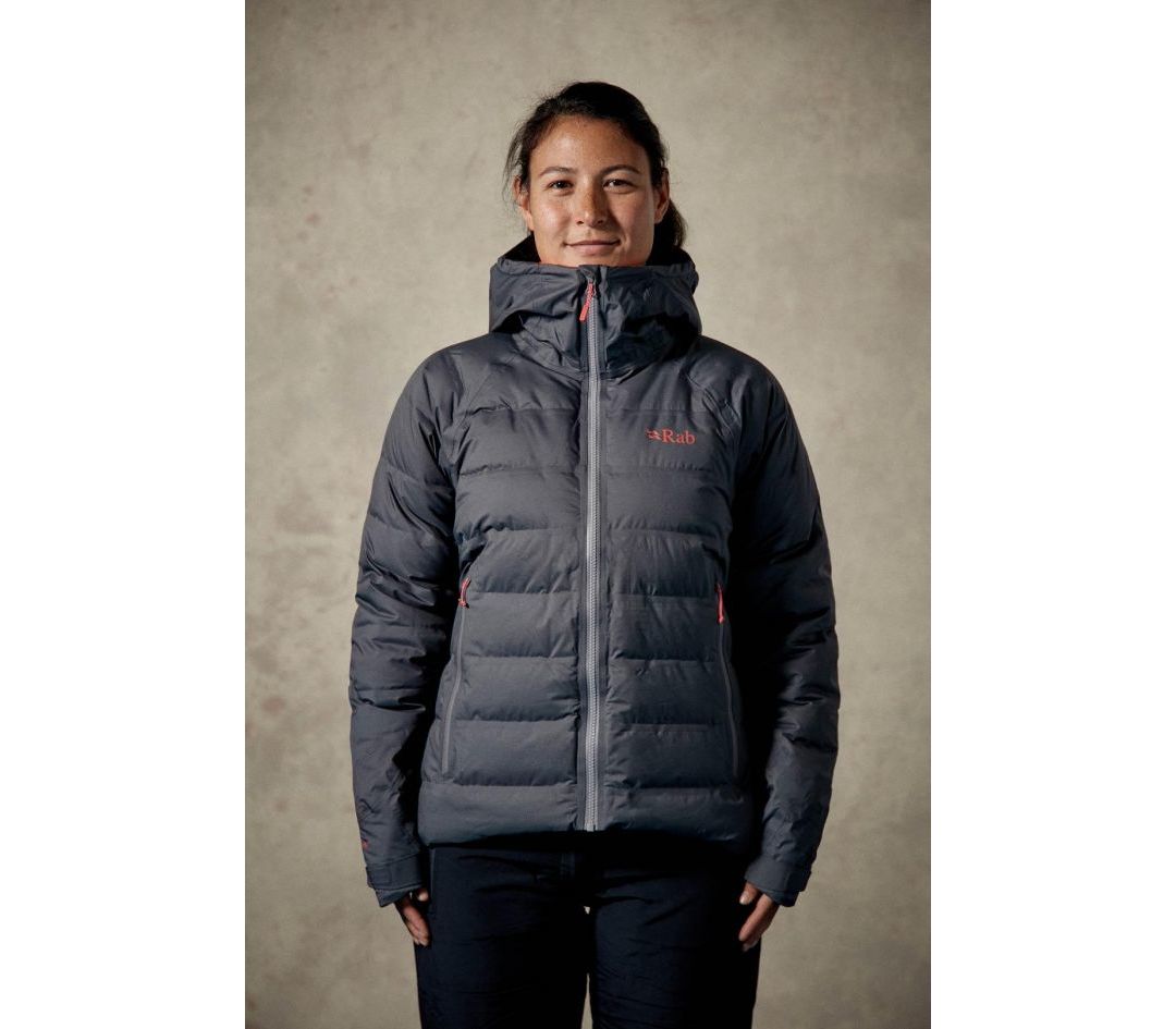 Додаткова фірмова гідрофобна обробка пуху Rab® Fluorocarbon free Hydrophobic Down, мембранна тканина Pertex Shield®, блискавки YKK, регульований незнімний капюшон. Манжети і капюшон додатково утеплені швидковисихаючою спеціальною тканиною Pyrotec™, зручна затягування низу куртки.