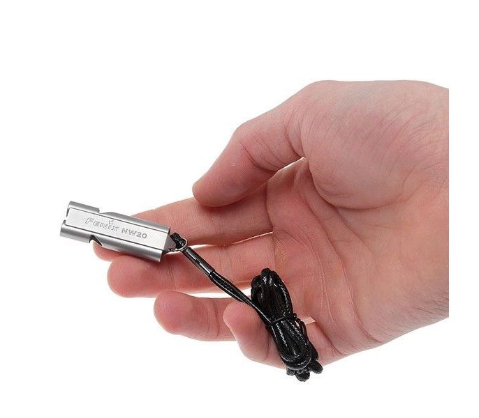 Свисток Whistle NW20 призначений для використання в надзвичайних ситуаціях, що вимагають подачі звукових сигналів. Він також підійде для подачі сигналів між окремими учасниками групи туристів, мисливцями, рятувальниками. Він виготовлений з 304 / 304L марки нержавіючої сталі, що використовується для виробництва металевого посуду. У даній моделі немає ніяких рухомих деталей, що сприяє її довговічності. Свисток може відтворити звук гучністю до 120 децибел, заощадивши при цьому 30% зусиль користувача. Whistle NW20 кріпиться до міцного лавсанового шнурка, який можна повісити на шию або ж прикріпити до лямки рюкзака. Свисток не займе багато місця серед вашого спорядження і допоможе надати неоціненну допомогу в складних ситуаціях.