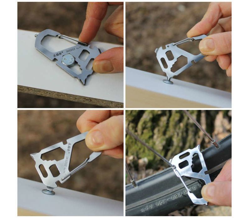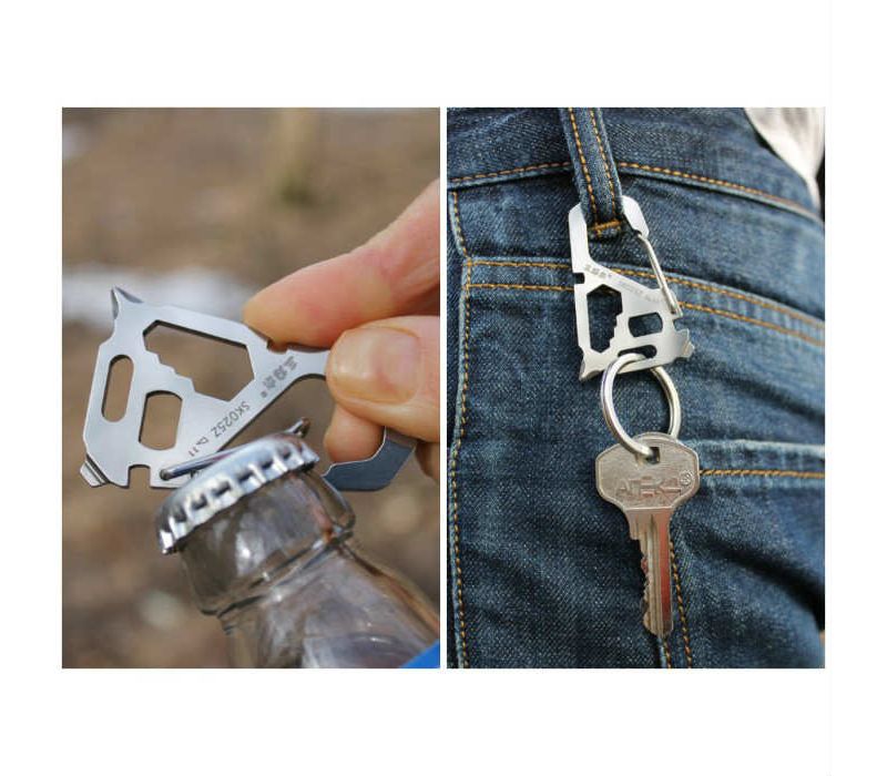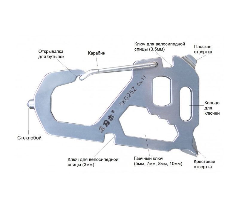 Мультифункціональний карабін Sanrenmu SK025Z - Універсальний міні мультитул, відмінний помічник в різних ситуаціях, будь це похід на природу або катання на велосипеді. Перевага - розмір , який становить 58 на 33 мм, з товщиною 3 мм. Мультитул виготовляється з нержавіючої сталі марки 420 і має вагу всього 22 м В арсеналі інструменту включені відкривачка для пляшок, склобій, плоска викрутка, шестигранний ключ різного діаметру, карабін, за допомогою якого можна закріпити модель до рюкзака або екіпіровці, а також кільце для ключів.