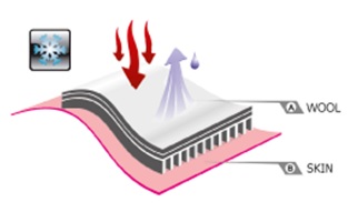 У зимовий час року шерсть абсорбує пари поту і виводить їх назовні, при цьому попереджаючи почуття вологості і липкості шкіри. Окреслені вище повітряні канали ізолюють тепло, що виходить від тіла. Це дуже важливо в холодних умовах, коли Ви спочатку активно рухаєтеся, а потім зупиняєтеся відпочити. На малюнку показано, як працює вовняне термобілизна в холодну пору року: