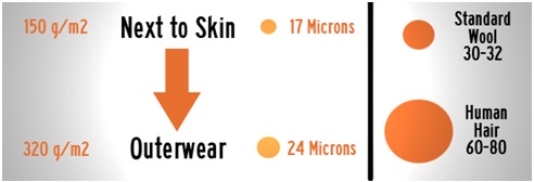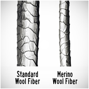 Завдяки цьому, термобілизна з вовни мериноса не викликає алергічних реакцій навіть у самих маленьких жителів планети Земля. На малюнку зліва зображено волокно звичайної шерсті, яка часто викликає роздратування шкіри, а праворуч волокно вовни мерино. Різниця в товщині істотна.