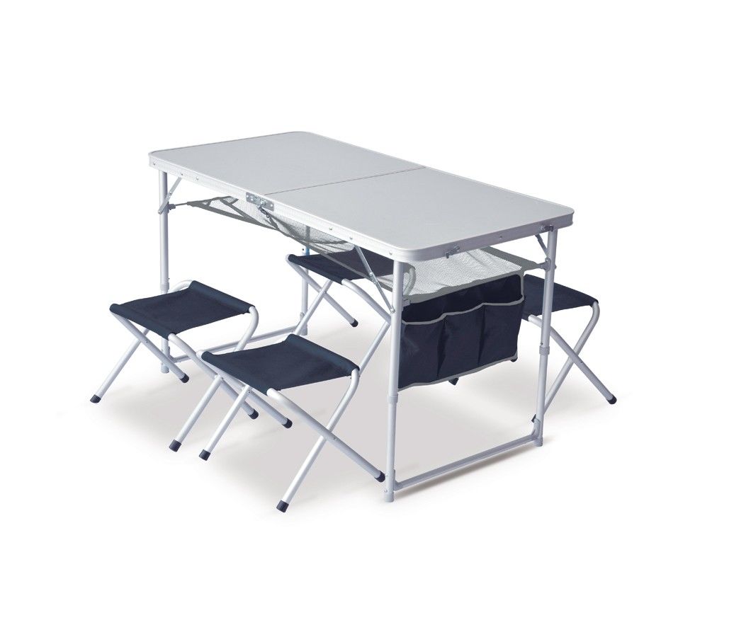 Набір меблів для пікніка Pinguin Set table + 4 stools торгової марки товарів для відпочинку і туризму Pinguin включає в себе розкладний стіл для пікніка і 4 складних стільчика. Набір складних меблів для пікніка стіл Table L 120 + 4 стільці компактно складається у валізу і не займає багато місця при транспортуванні. Набір кемпінгових меблів TABLE SET-зручний, компактний і дуже міцний набір складних меблів на 4-х чоловік для пікніка, риболовлі, відпочинку, відмінно підійде як на дачі, так і на природі. Набір складається з розкладного столика і 4-х табуреток. Компактний столик зі складними ніжками може витримувати навантаження до 30 кг.