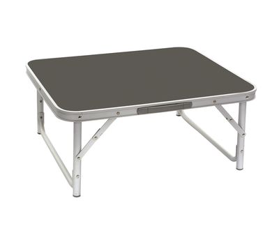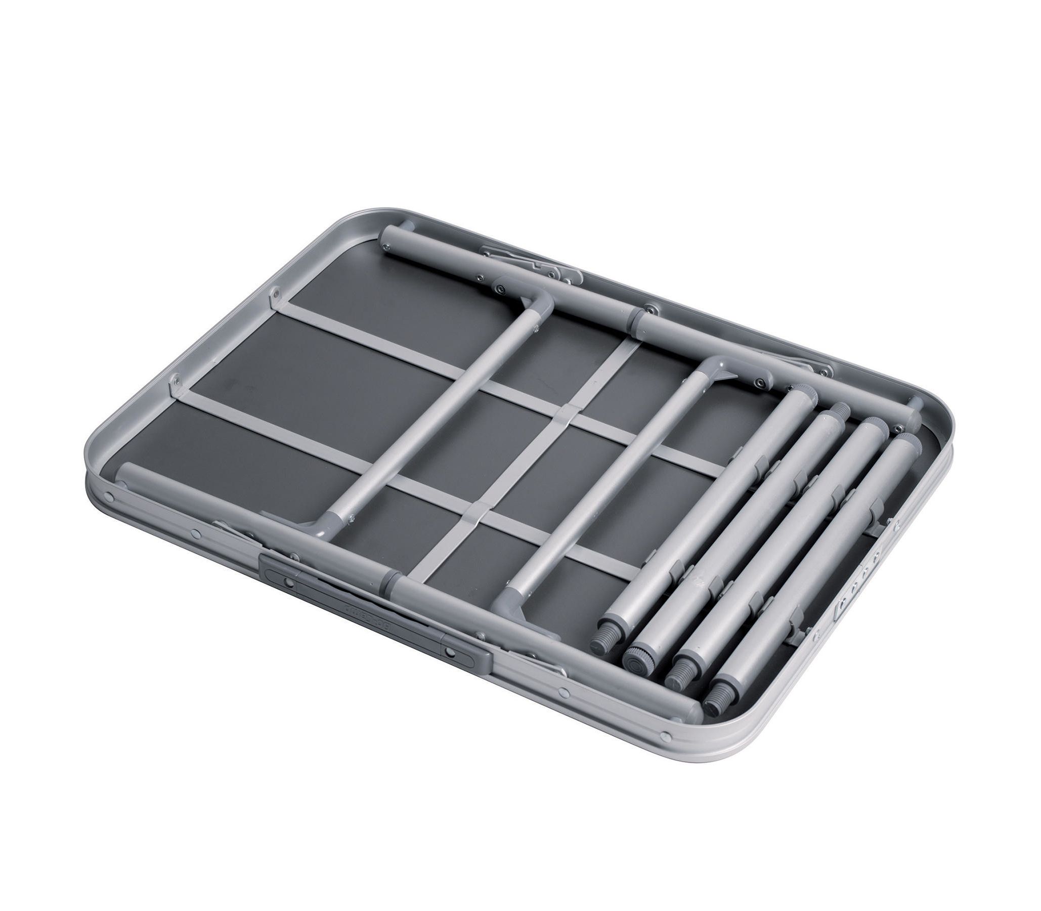 Завдяки легкій алюмінієвій конструкції, знімним ніжкам та товщині менше 4 см в складеному вигляді стіл зручно транспортувати та зберігати. Міцна стільниця з МДФ має сіре покриття, а каркас витримує навантаження до 25 кг. Висота регулюється в двох рівнях — 30 та 70 см.