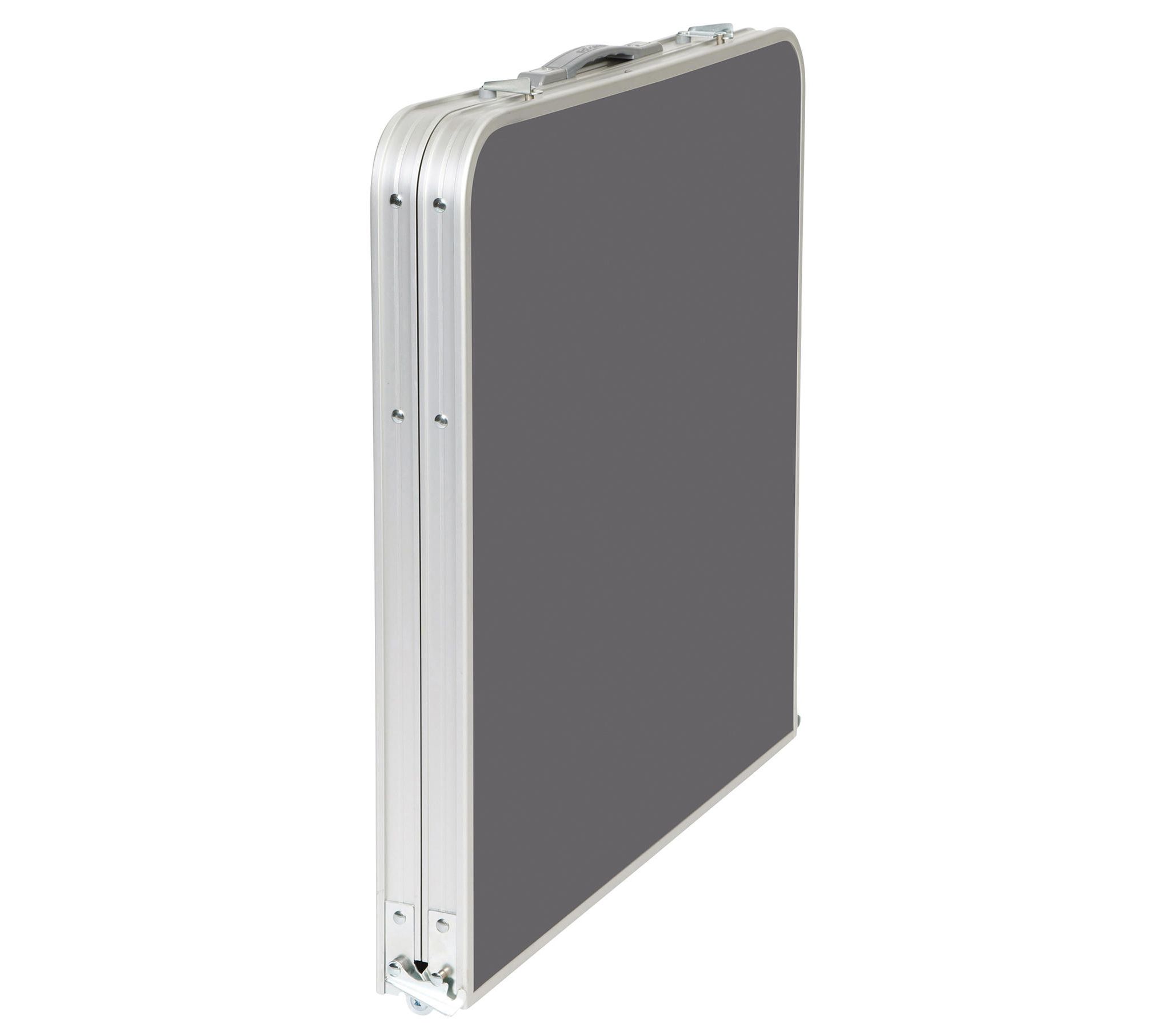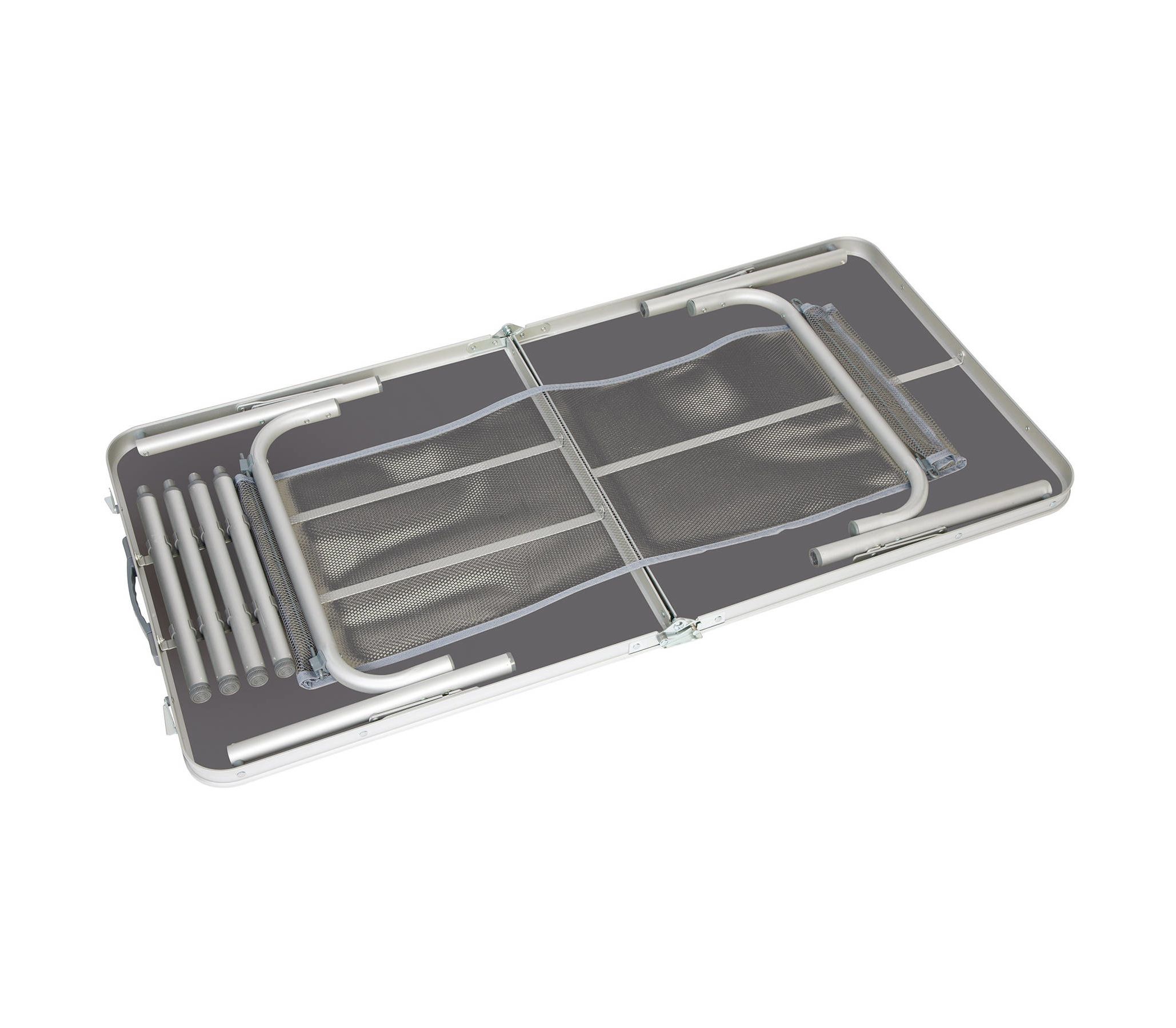 Алюмінієвий стіл Bo-Camp Case Model 120x60 cm - довгий, але при цьому компактний у складеному вигляді стіл для повноцінного розміщення шістьох персон. При цьому ніжки столу регулюються по двом рівням висоти (36/70 см). Ніжки столу можна відрегулювати на нерівній поверхні за допомогою гвинтів. Як зазначалось, стіл можна дуже компактно зберігати і переносити у вигляді кейса, завдяки знімним ніжкам, складаній стільниці і ручці. Із додаткових зручностей варто відзначити, що стіл оснащений знімною сіткою, що розташовується під стільницею.