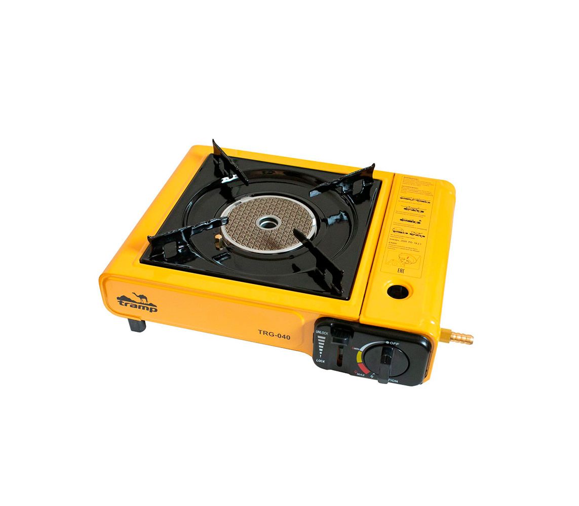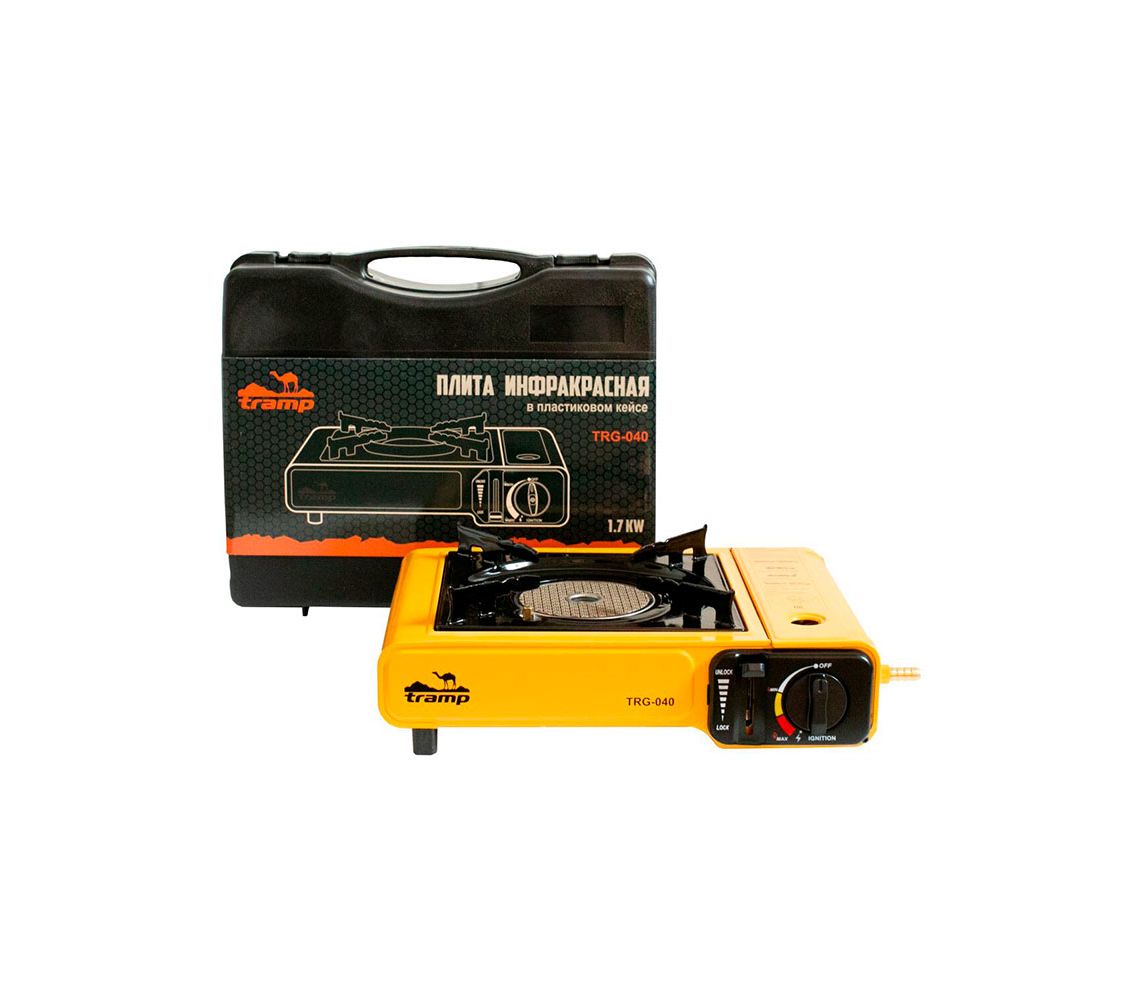 Компактна туристична газова плита Tramp TRG - 040 з інфрачервоною (без відкритого полум'я) керамічним пальником. Плита на одну конфорку для приготування їжі в польових умовах. Плита економить до 30% палива в порівнянні з туристичними плитами традиційної конструкції. Є клапан контролю тиску, а також вбудований перехідник на зовнішні, великі LGP газові балони «дачного» типу. Упаковується в пластиковий транспортний кейс.