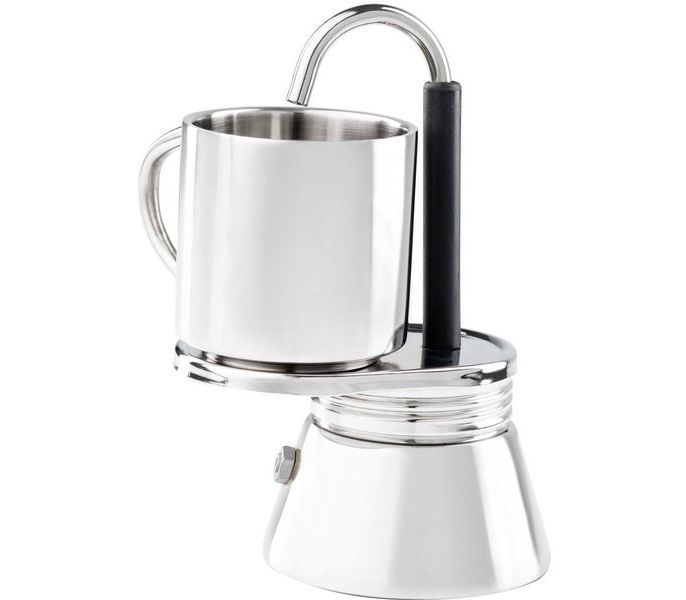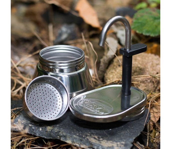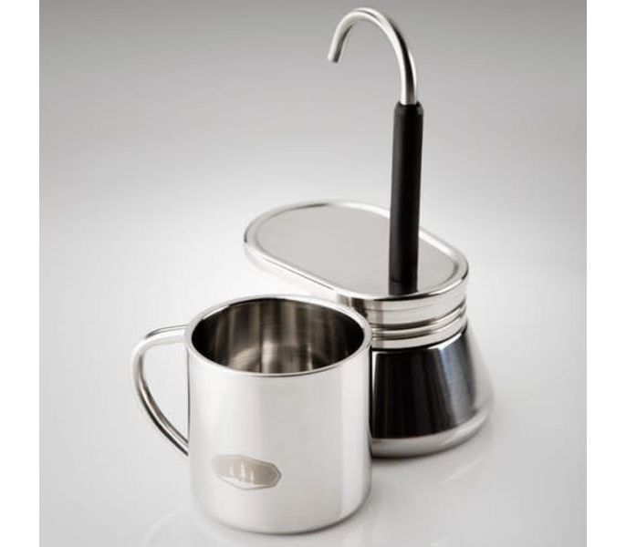 Набір для приготування еспрессо, що включає маленьку кавоварку гейзерного типу і кухоль з подвійними стінками (термокружку) об'ємом 75 мл.підходить для приготування однієї невеликої чашки Еспрессо на газовому пальнику в польових умовах або електричної та індукційної плити в домашніх умовах.