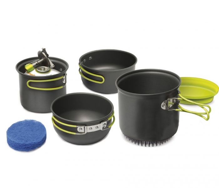 Весь посуд з цього набору виготовлений з якісного анодованого алюмінію. Одна з каструль оснащена спеціальним теплообмінним елементом, що економить до 30% пального. У комплект входять 2 каструлі, 2 кришки, 1 захисна кришка для теплообмінного елемента, якою можна при необхідності користуватися як плоскою мискою, 1 губка для чищення. Анодоване покриття всіх виробів робить їх вогнестійкими і зносостійкими. Конструкція і розміри посуду дозволяють укладати одну каструлю в іншу. Ручки посуду мають спеціальне силіконове покриття, тому не нагріваються.