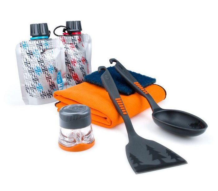 Набір посуду туристичний GSI Outdoor Pack Kitchen включає в себе: лопатку, ложку, ємність для солі/перцю, 2 ємності для приправ, скребок, рушник, сітку-чохол для транспортування. Складні лопатка і ложка виготовлені з високотемпературного нейлону. Ємність для перцю / солі не пропускає вологу, зберігаючи вміст в сухості. Для інших приправ передбачені два м'яких контейнера. Всі вхідні в комплект предмети характеризуються функціональністю, зручністю і чудовим дизайном. Такий набір незамінний на заміському відпочинку, кемпінгу або в автомобільних подорожах. Кількість предметів в наборі: 8 шт.Склад комплекту: Склад комплекту: складні лопатка і ложка, ємність для солі / перцю, 2 ємності для приправ, скребок, рушник, сітка-чохол.