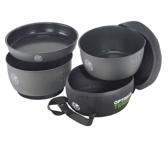 Великий набір посуду з анодованого алюмінію. Спеціальний радіатор-теплообмінник скорочує час закипання на 20%, економлячи газ. Тонкий неопреновий чохол, що входить в комплект може бути використаний як термос, що не дозволяє їжі остигати в казанку.