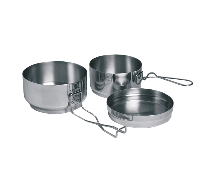 Набір посуду з нержавіючої сталі, який складається з трьох компонентів: казанок 1,25 л, казанок 0,85 л, кришка.