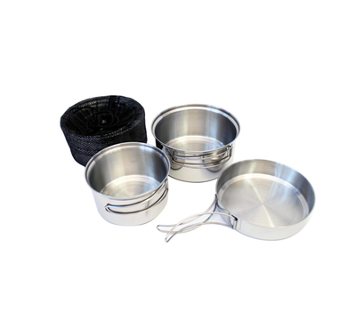 Набір посуду з нержавіючої сталі, який складається з трьох компонентів: казанок 1,5 л, казанок 1.0 л, казанок/кришка 0,5 л.