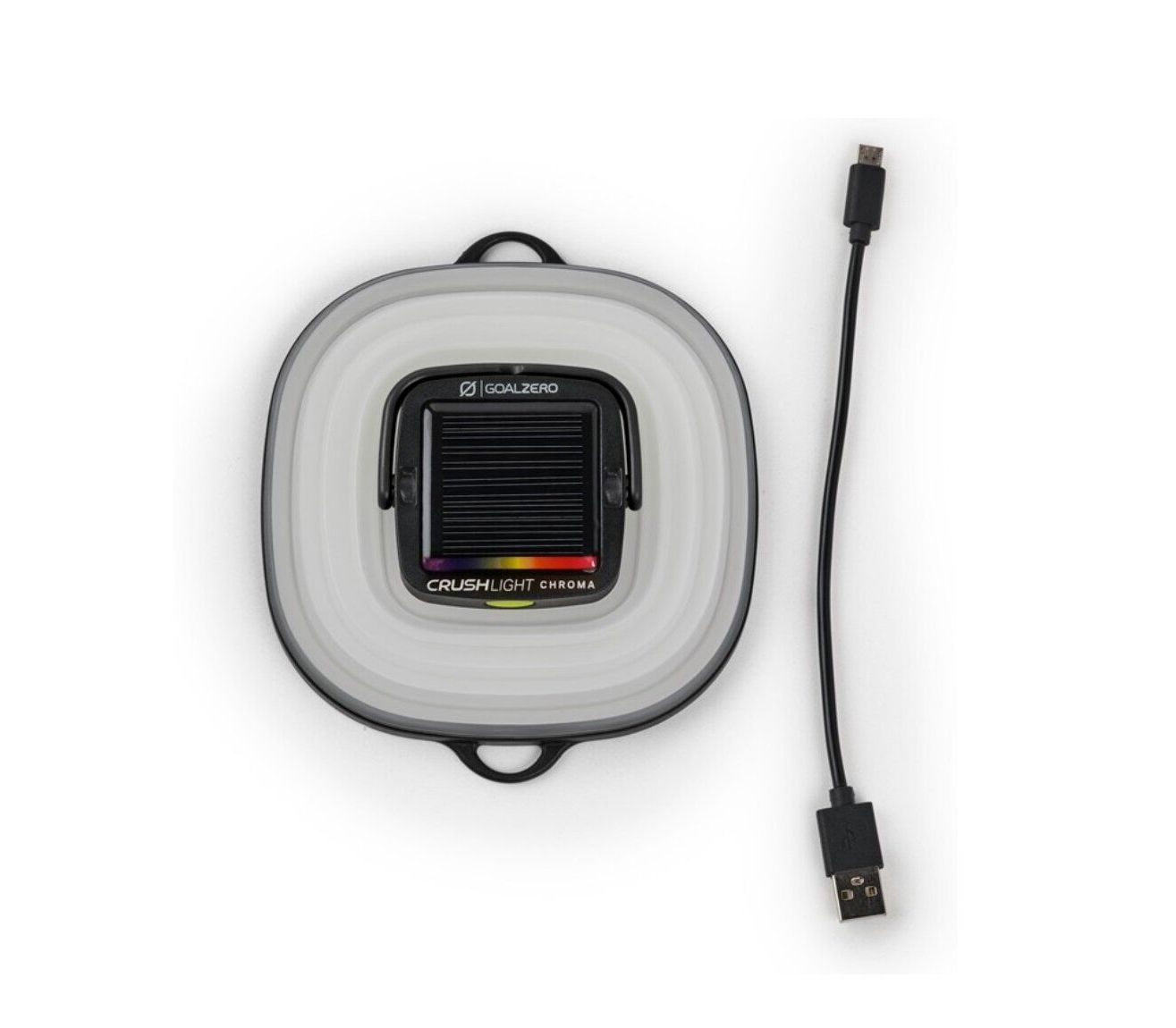 Легкий портативний ліхтар GoalZero Crush Light Chroma перетворить будь-який кемпінг в яскраву вечірку. Дуже зручний в транспортуванні і зберіганні, складається до товщини в півтора сантиметра. Ліхтар має шість кольорових режимів, три режими білого кольору і режим мерехтіння свічок, відзначений нагородами Crush Light. Ліхтар має вбудовану сонячну панель. Також заряджається від будь-якого USB-порту. Забезпечує яскраве світло потужністю 60 люмен і зможе висвітлити як стіл або альтанку під час вечері, так і з кемпінговий табір. Розкладний гачок ліхтаря дозволяє прикріпити його в наметі або до гілок дерев.