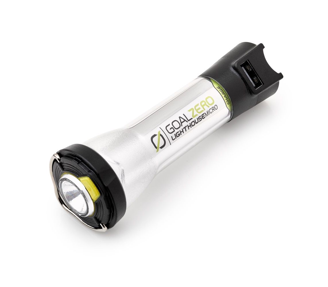 Ліхтар-зарядка Goal Zero Lighthouse Micro Charge-універсальний компактний кемпінговий ліхтар із зарядним пристроєм покликаний подолати темряву, що поглинула кемпінг після заходу сонця. Світловий потік в 150 люмен забезпечує яскраве потужне світло. Ліхтар здатний працювати до 170 годин в режимі економії. Є два способи підзарядки ліхтарик - від мережі протягом 3,5 годин, а також від сонячних панелей Nomad. Корпус виготовлений із пластику з системою захисту IPX6, містить індикатор заряду батареї.