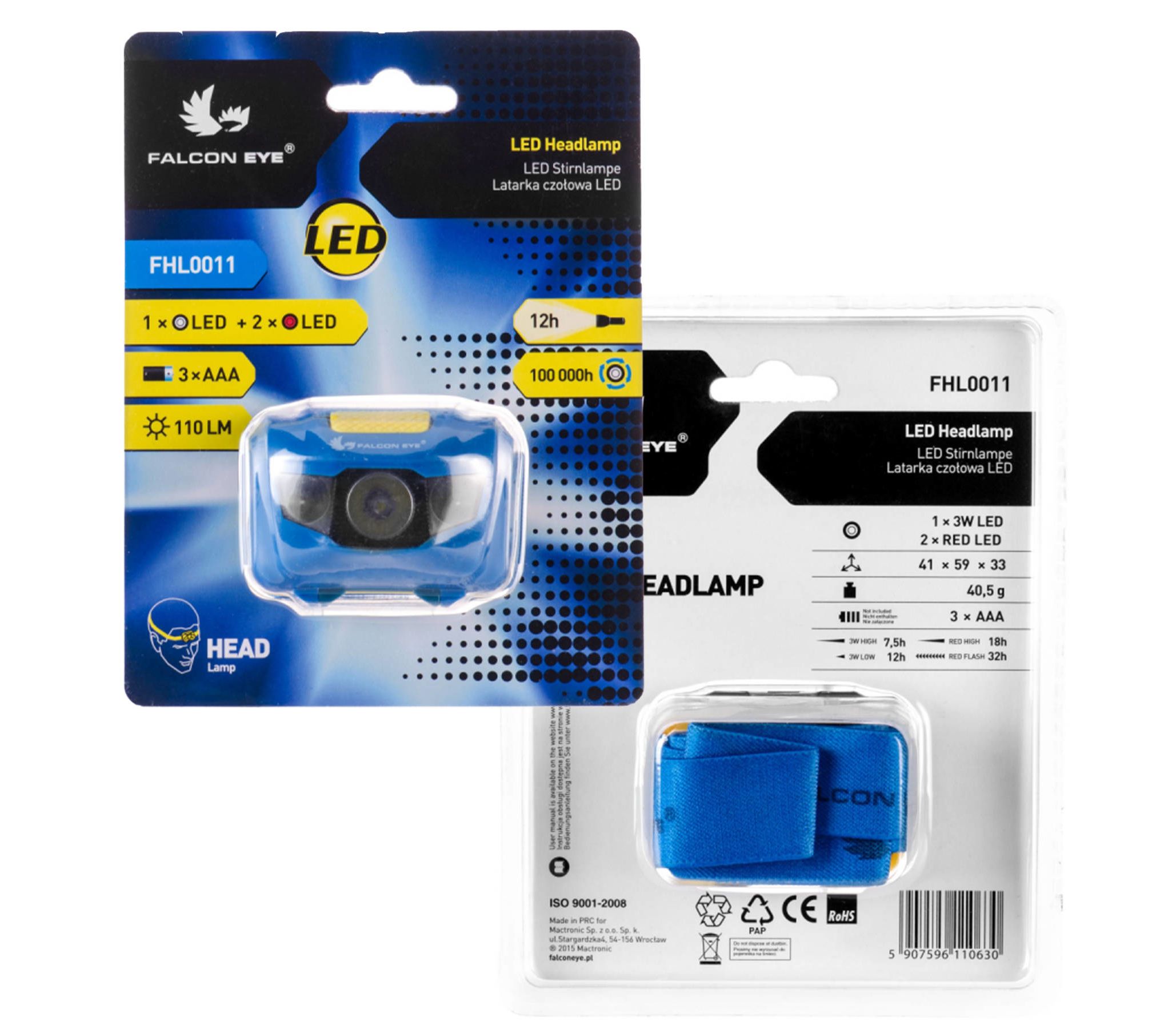 Falcon Eye (110 Lm) Cool White/Red укомплектований еластичним регульованим ременем, окружністю до 60 см і трьома батарейками ААА (R03).