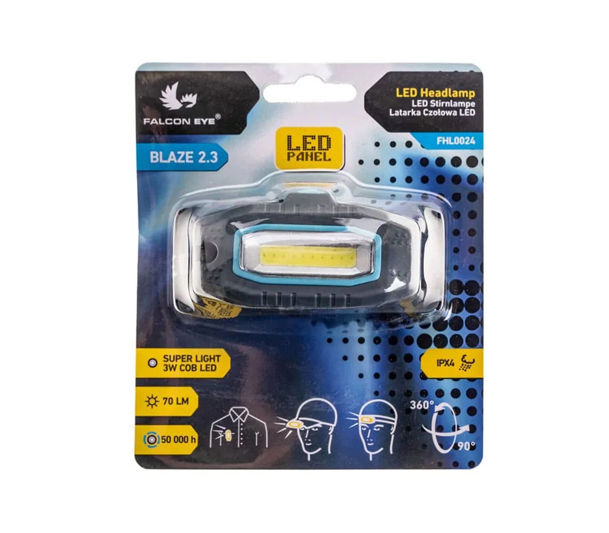 Налобний ліхтар Falcon Eye Blaze 2.3 (70 Lm) - це дуже легкий і компактний ліхтар, який важить всього 66 грам, із спеціальним одноточковим кульовим кріпленням, що дозволяє обертати його на 360º. Ще приємним доповненням стане кліпса, що дозволяє зачепити ліхтар за козирок кепки або елементи одягу. Ця модель, обладнана світловою панеллю COB Led 3 Вт і гладким рефлектором, створює широкий світловий промінь, здатний ефективно освітлювати місцевість на відстані до 20 м. А легкий пластиковий корпус забезпечує захист від падіння на бетонну поверхню з висоти 1 м і вологостійкість за стандартом IPX4 (захист від водяних бризок з будь-якого напрямку). Тобто ліхтареві не страшний дощ чи випадкове падіння. Все це робить Falcon Eye Blaze 2.3 чудовим вибором для занять спортом у темний час доби, в майстернях, де потрібне широке поле засвітки та просто для повсякденного використання.