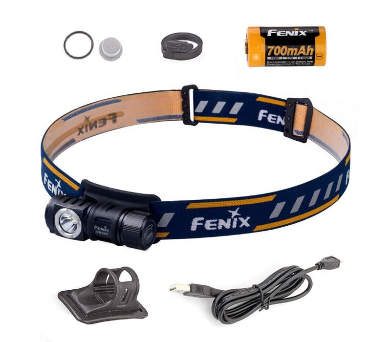 Комплектація: налобний ліхтар, акумулятор 16340 Fenix 700 mAh, кабель для зарядки, змінна гумова кнопка, змінний силіконовий ущільнювач, запасний силіконовий тримач.