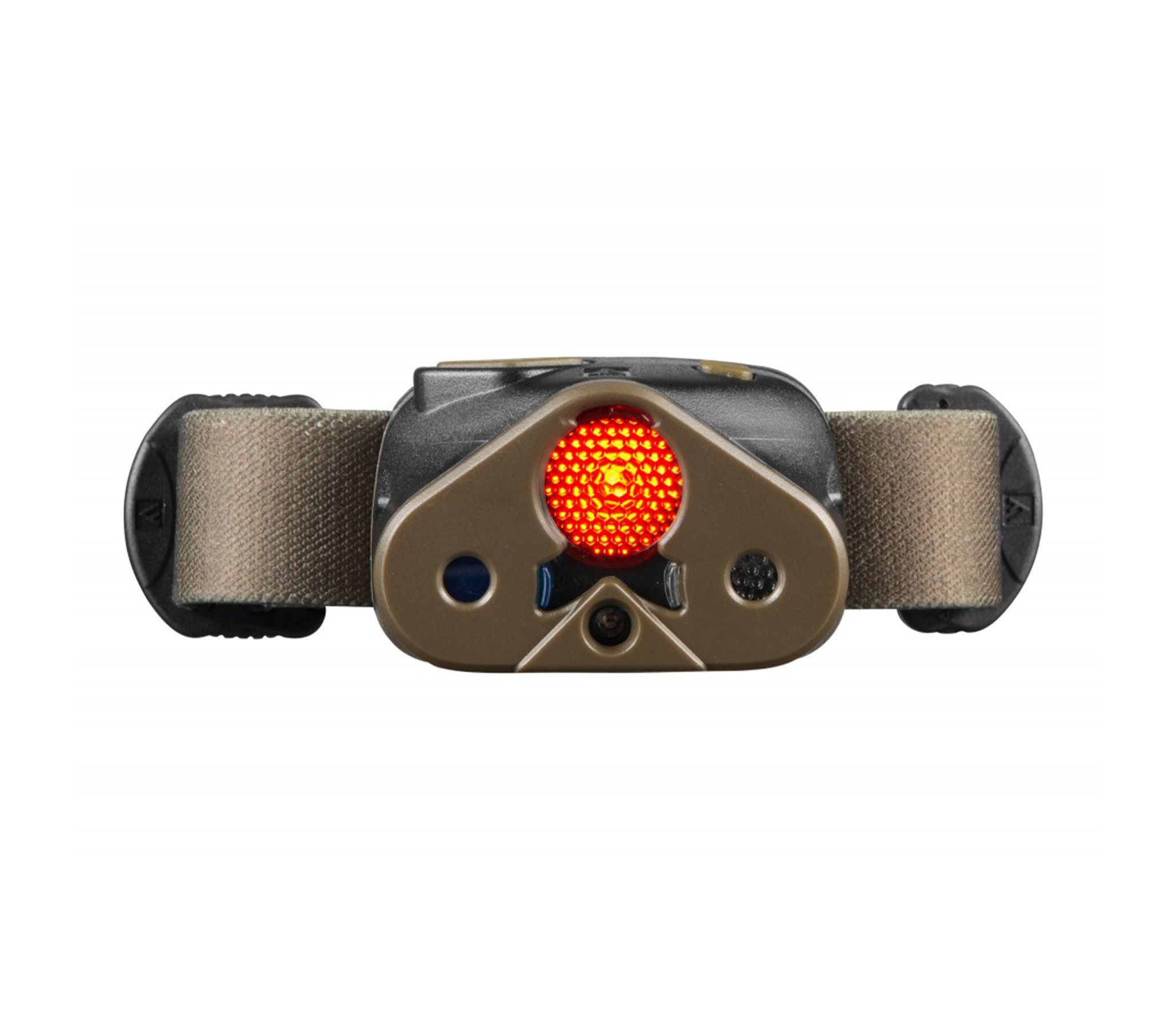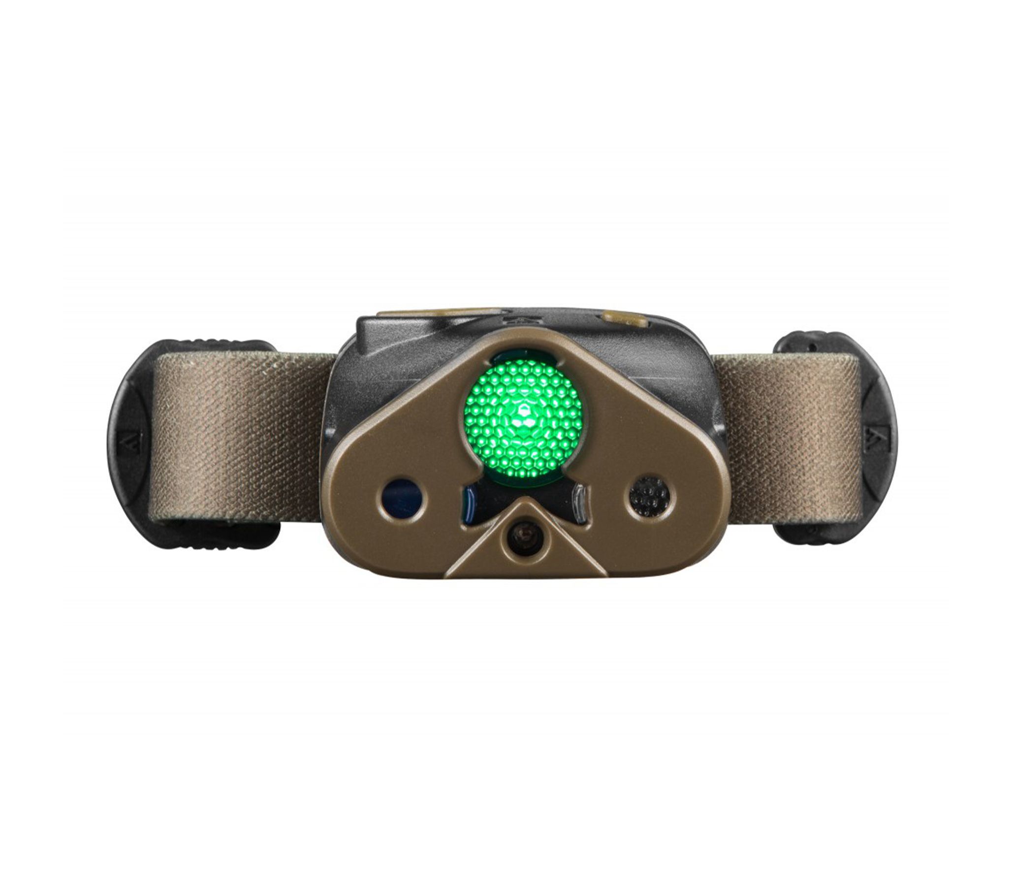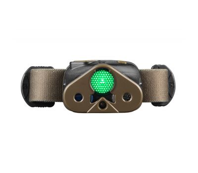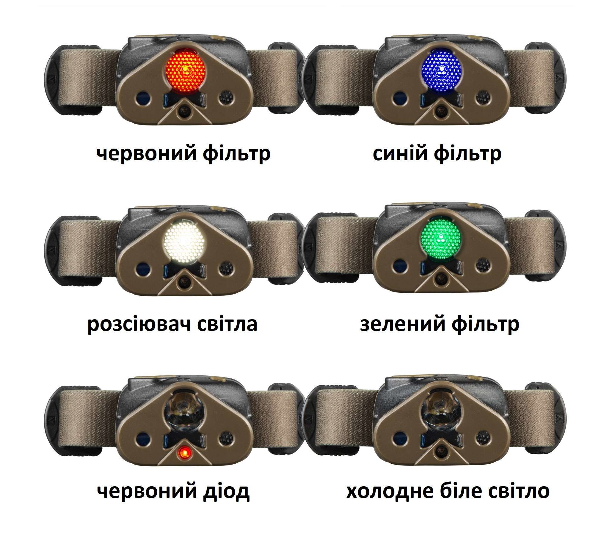 Ліхтар укомплектований універсальним кріпленням для установки в гніздо для приладу нічного бачення на касці або на стропі MOLLE, еластичним регульованим ременем з силіконовим покриттям з внутрішньої сторони, трьома батарейками ААА Energiser, прозорим дифузором і трьома світлофільтрами, необхідними для орієнтування у нічний час доби. Червоне світло не заважає нашому нічному зору, і не видно для багатьох звірів, що дуже важливо для мисливців. Зелений сприяє більш правильній передачі кольору, завдяки чому можна читати карти в темряві, а також рухатися в темряві по заданому маршруту, практично не привертаючи до себе уваги. Синій колір зберігає нічний зір, також дозволяє краще орієнтуватися в тумані.