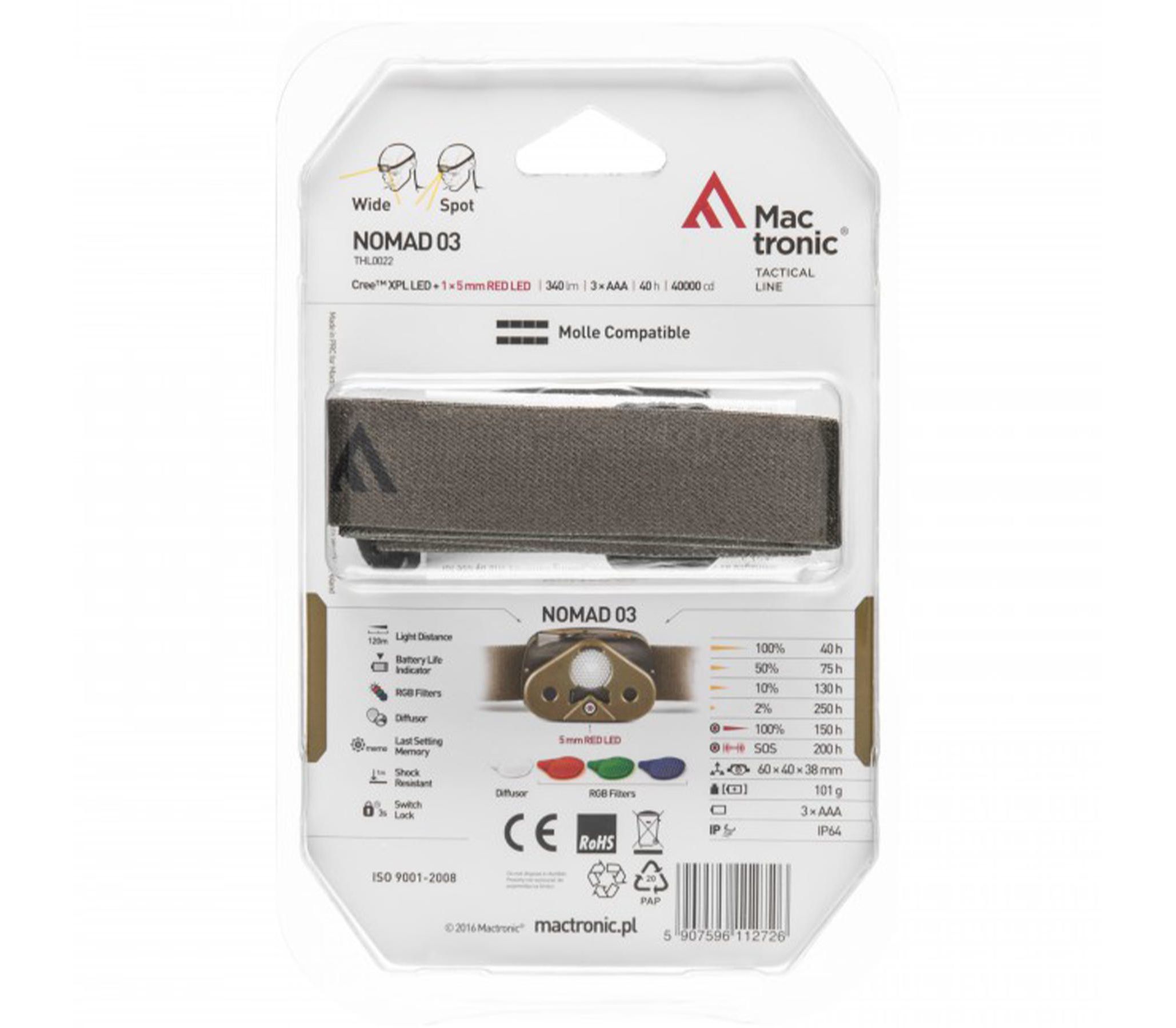 TIR лінза створює досить широкий і при цьому дальній промінь світла основного діода, здатний освітлювати територію на відстані до 120 м, а завдяки знімному дифузору ви зможете освітлити кемпінговий табір, або інше місце дислокації широким заливним променем. Також у цій моделі є окремий червоний сигнальний світлодіод, який може працювати у двох режимах: постійне світіння або SOS. Функція блокування живлення (Switch Lock) вбереже від випадкового запуску ліхтаря під час носіння в кишені або інших місцях. Ремінець із внутрішньої сторони покритий силіконом, завдяки якому він добре тримається на шоломі. Всі вище згадані переваги, роблять Macronic Nomad 03 відмінним вибором для широкого кола користувачів від співробітників охоронних і силових структур, мисливців до шанувальників туризму та кемпінгу. Ще налобний ліхтар Nomad відповідає встановленим вимогам для нічних стрибків із парашутом. Джерелом живлення для ліхтаря є 3 батареї ААА – одні з найпоширеніших, компактних та недорогих.