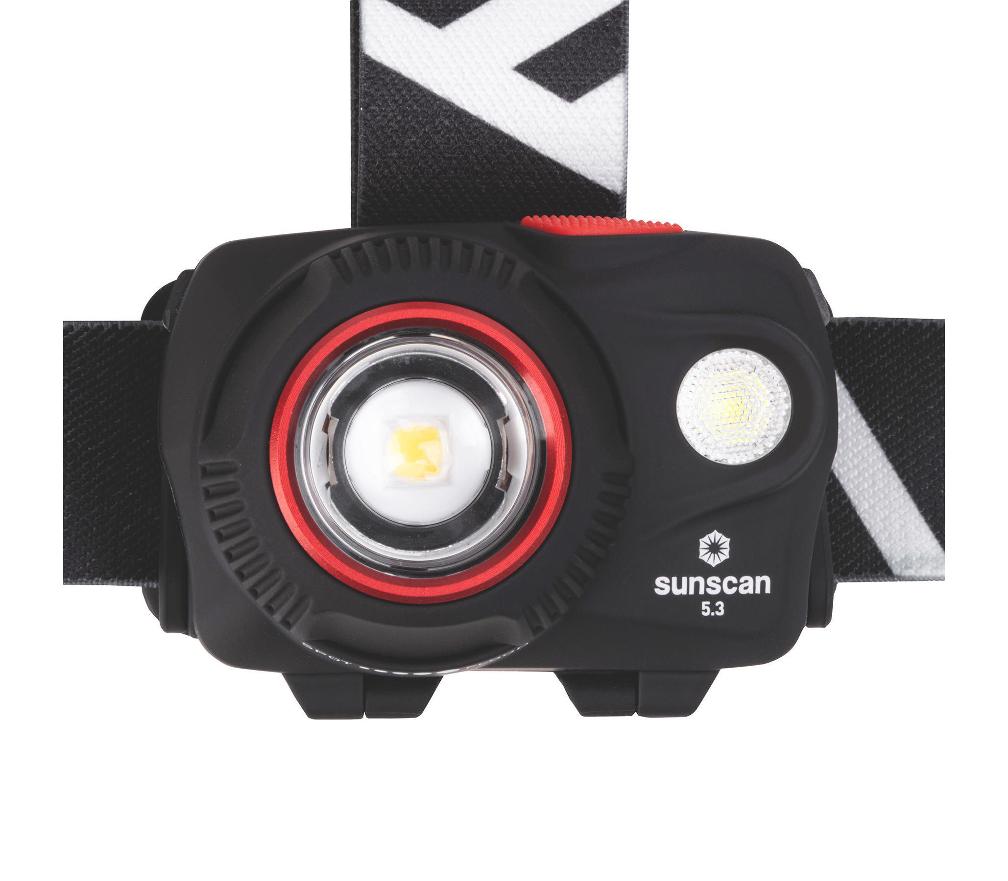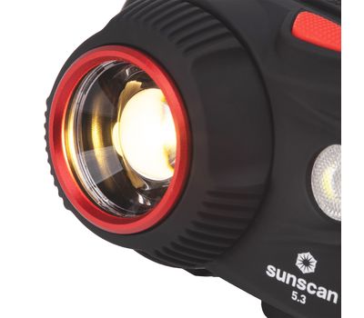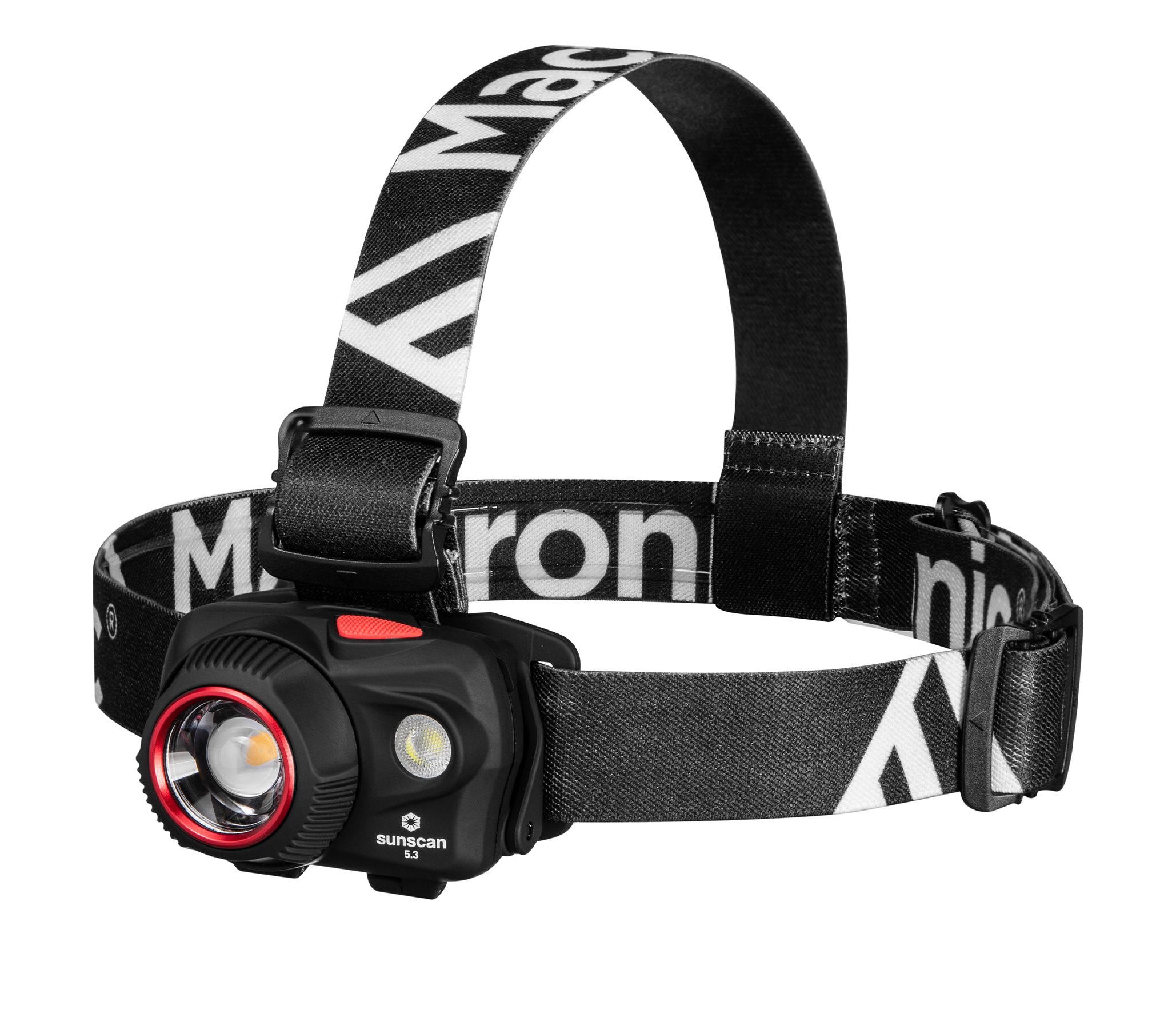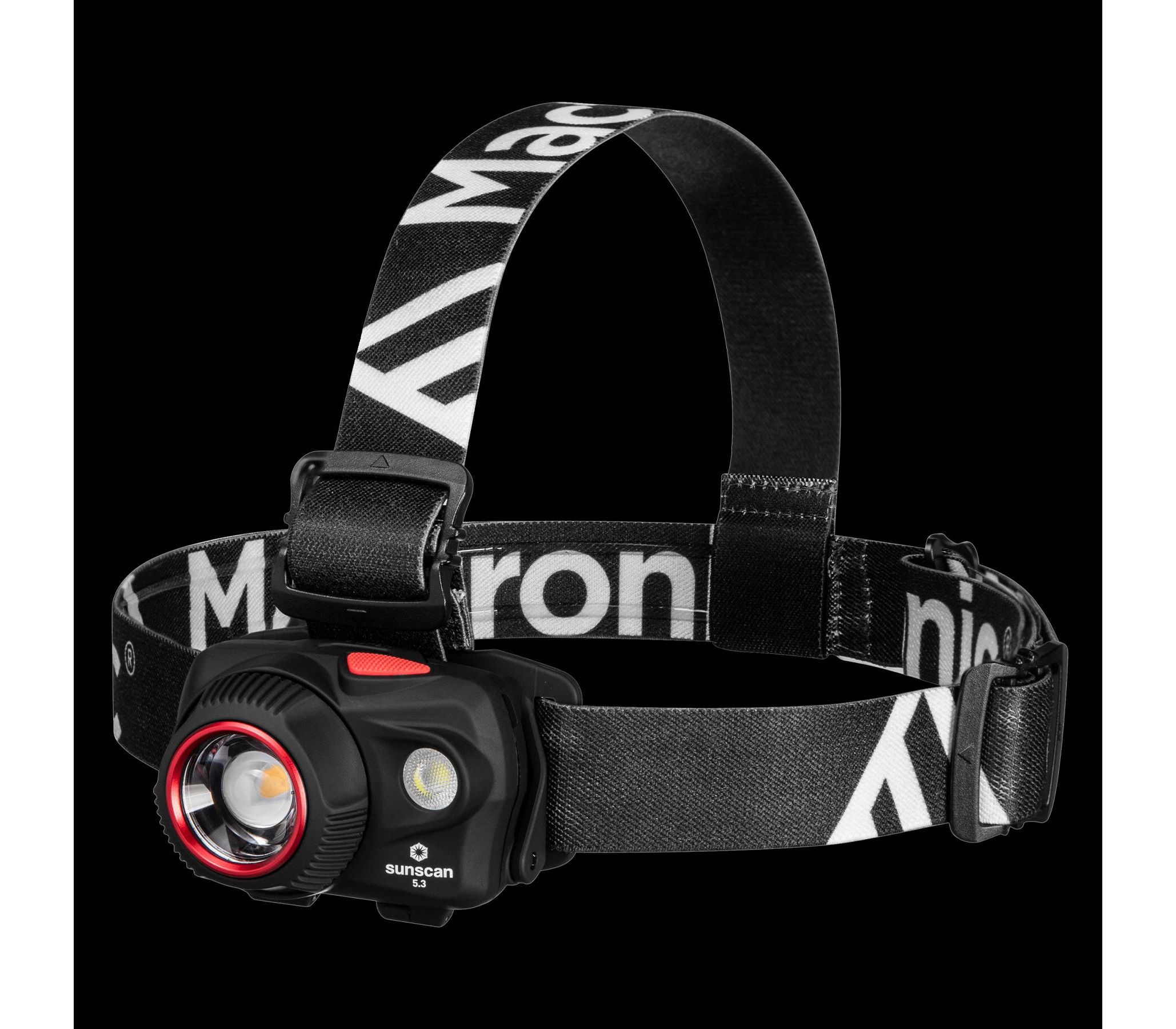 Висувна лінза плавно регулює ширину променя. Завдяки цьому Mactronic Sunscan 5.3 здатний ефективно освітлювати як місцевість на відстані до 123 метрів, так і освітлити предмети перед вами. Ремінець із внутрішньої сторони покритий силіконом, завдяки якому він добре тримається на голові або головному уборі, а також додатково має маківковий пасок для кращого балансування. Крім того, система альтернативного живлення DSS™ дозволяє використовувати батарейки ААА - одні з найдешевших і найпоширеніших. Кут нахилу ліхтаря регулюється у шести положеннях.