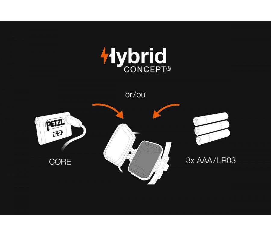 - HYBRID CONCEPT: ліхтар також можна використовувати з акумулятором CORE, при цьому змінюються його характеристики (показник максимального світлового потоку при використанні акумулятора-500 люмен)