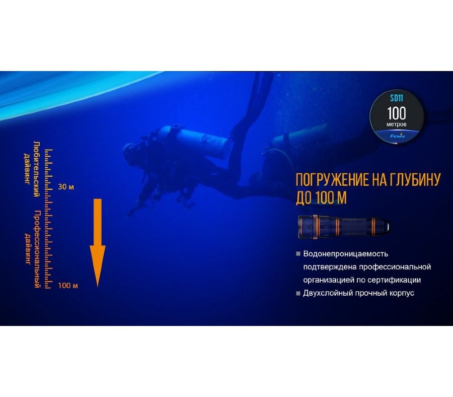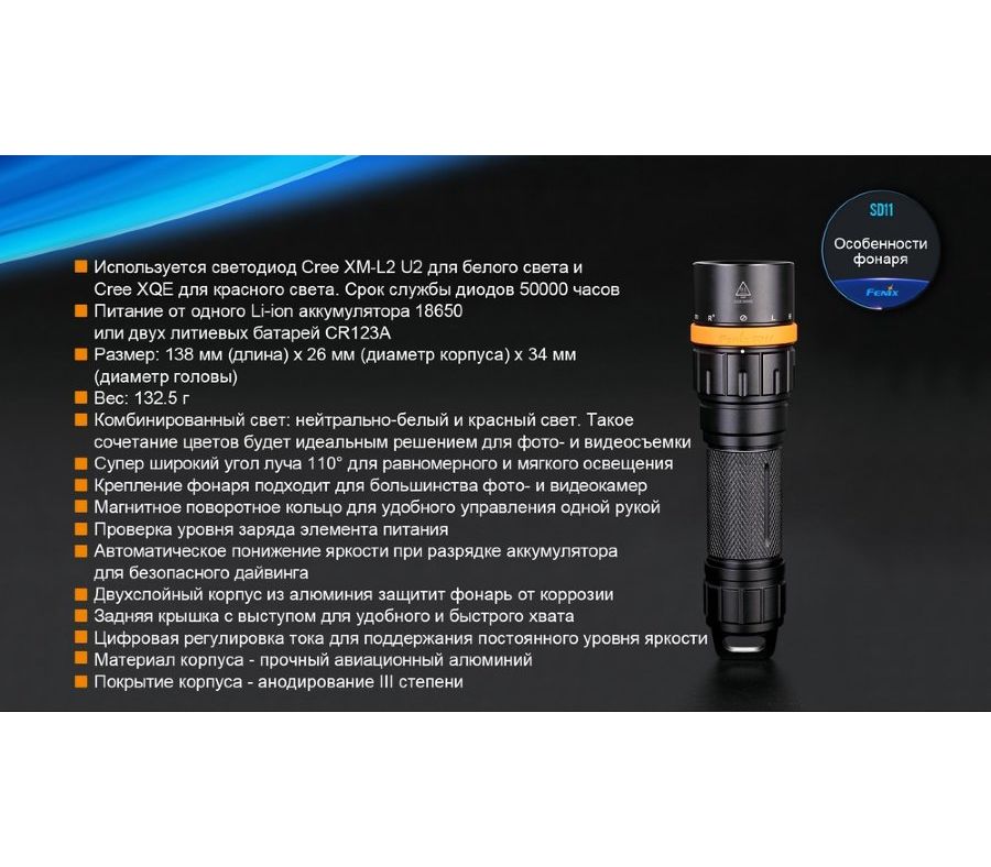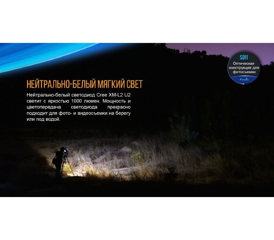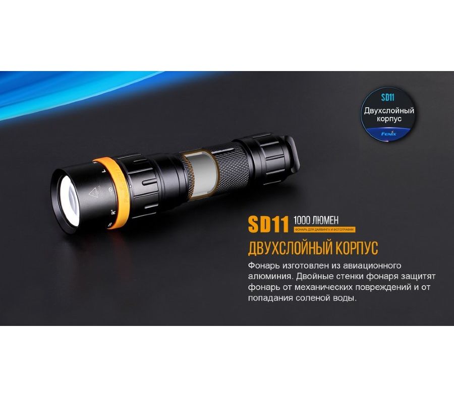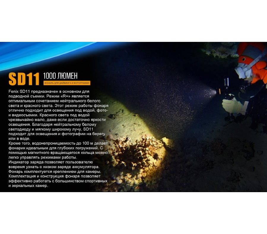 Fenix SD11 входить в серію ліхтарів для підводного плавання. Однак особливість даної моделі полягає в тому, що найкраще її використовувати для фото - і відеозйомки під водою. Ліхтар оснащений двома діодами: нейтрально-білим Cree XM-L2 U2 і червоним Cree XQE. Він в змозі працювати в трьох режимах з максимальною яскравістю світла - 1000 люмен (режим High). При цьому, дистанція освітлення складе 45 метрів. Однак варто враховувати, що при нагріванні робочого вузла до 65°С, автоматично спрацює механізм захисту від перегрівання, який знизить яскравість світла до 700 люмен. Колишня яскравість повернеться відразу ж, як тільки ручний ліхтар трохи охолоне.