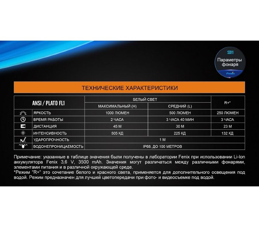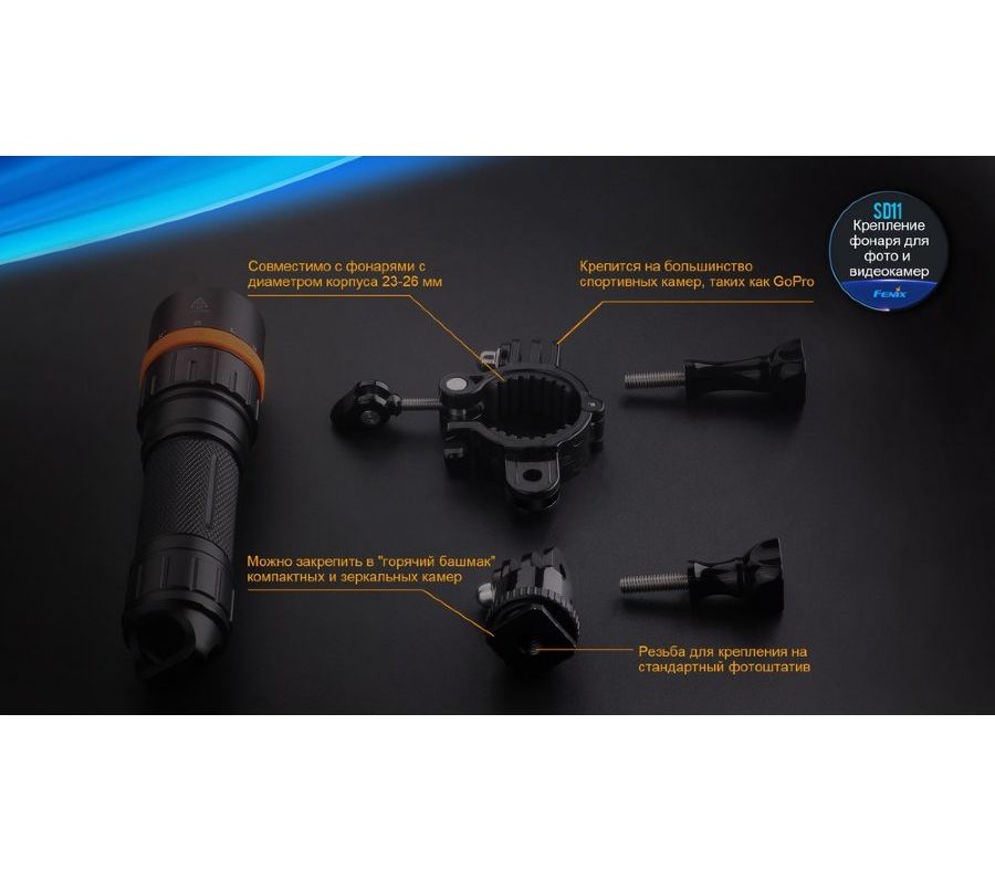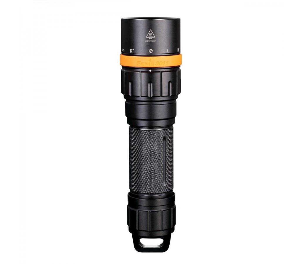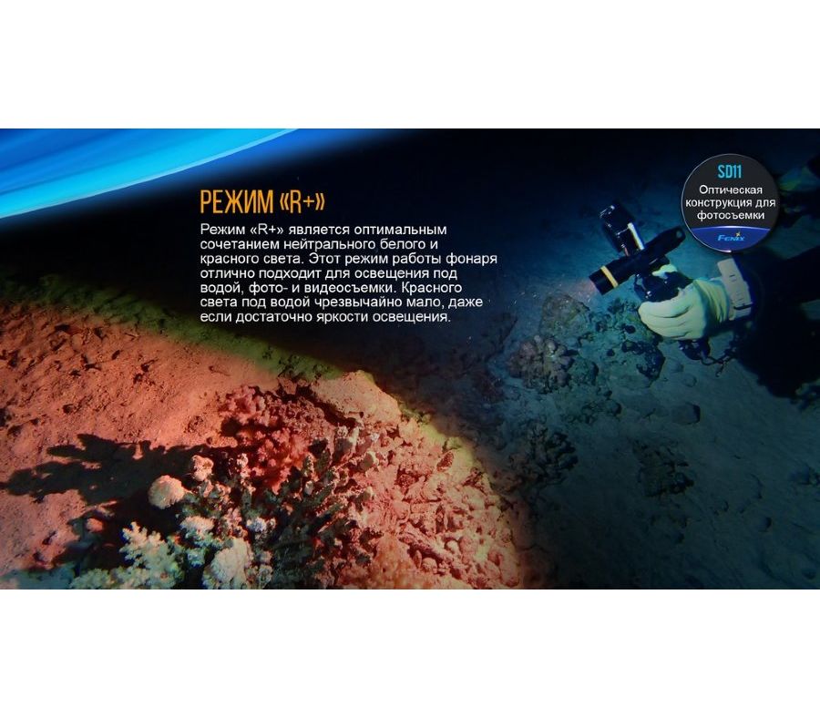 Fenix SD11 входить в серію ліхтарів для підводного плавання. Однак особливість даної моделі полягає в тому, що найкраще її використовувати для фото - і відеозйомки під водою. Ліхтар оснащений двома діодами: нейтрально-білим Cree XM-L2 U2 і червоним Cree XQE. Він в змозі працювати в трьох режимах з максимальною яскравістю світла - 1000 люмен (режим High). При цьому, дистанція освітлення складе 45 метрів. Однак варто враховувати, що при нагріванні робочого вузла до 65°С, автоматично спрацює механізм захисту від перегрівання, який знизить яскравість світла до 700 люмен. Колишня яскравість повернеться відразу ж, як тільки ручний ліхтар трохи охолоне.